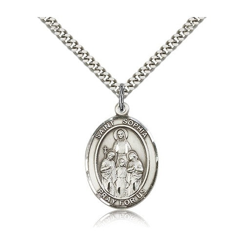 Sterling Silver St. Sophia Pendant on a 24" Light Rhodium Heavy Curb Chain with clasp. Size: 1 x 3/4. Made in the USA.