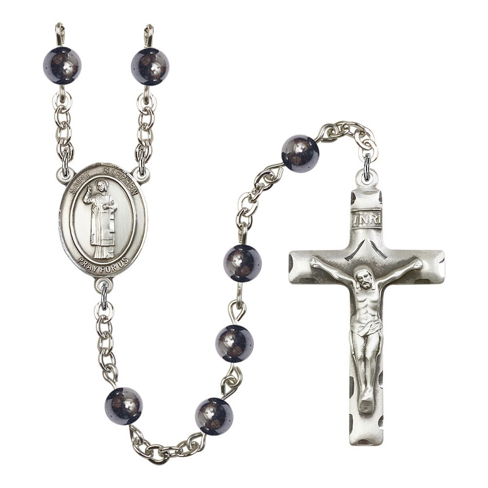 Silver Finish Rosary features 6mm Hematite beads. The centerpiece features a St. Stephen the Martyr medal..