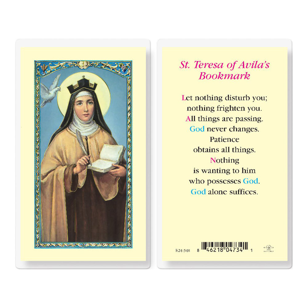 Celebrate St. Teresa of Avila's spiritual legacy with this exquisite laminated prayer card. Featuring her serene image and the profound "St. Teresa's Bookmark" on the back, it offers comfort and encouragement in faith. Perfect for wallets, prayer books, or as a nightstand reminder. This Italian-made card is a thoughtful gift for those seeking strength and trust in their spiritual journey.
