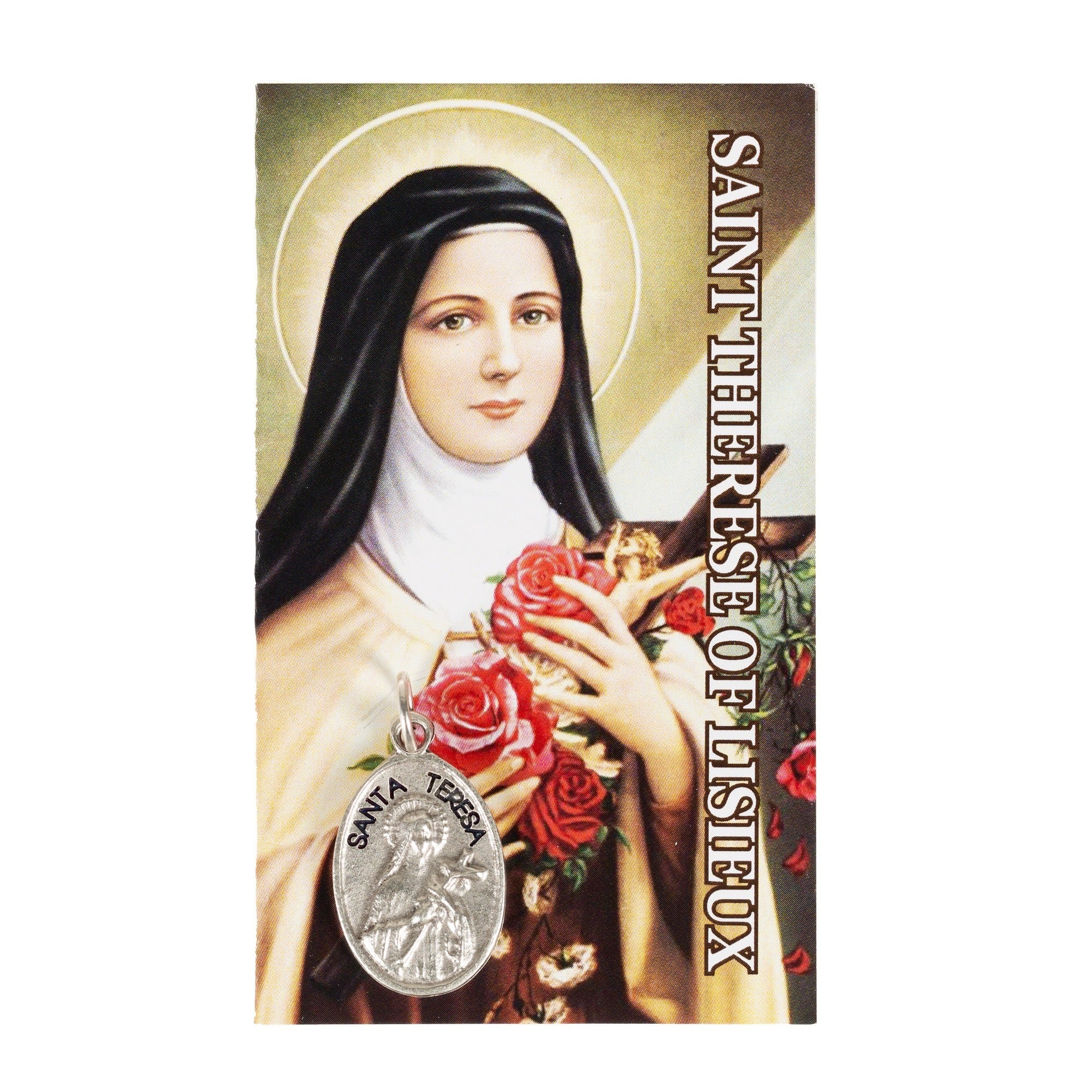This St. Therese of Lisieux set includes an oxidized silver medal and a vibrant prayer card, ideal as a small gift or bookmark. Featuring St. Therese with roses and a Crucifix as painted by her sister Celine, it's perfect for inspiration. Made in Italy, this set honors the patron saint of missionaries, florists, and the afflicted.