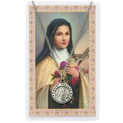 Laminated St. Therese L.F. prayer card with a pewter St. Therese L.F. medal on a 18" silver plated chain. Comes polybagged.