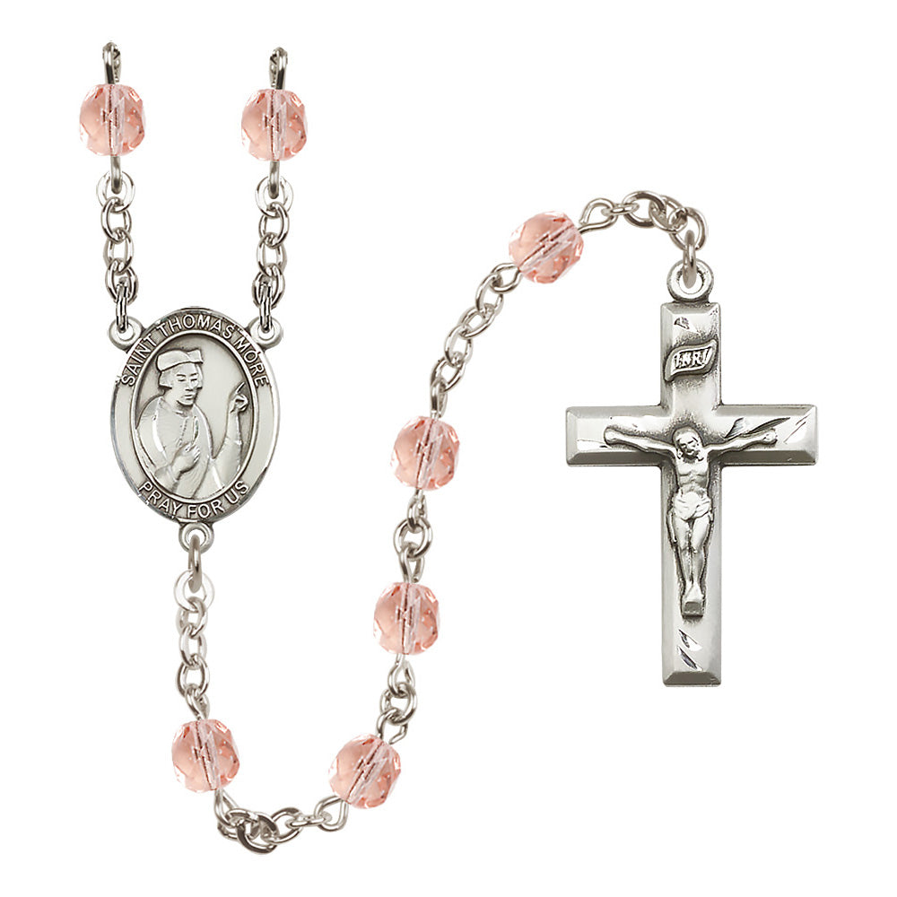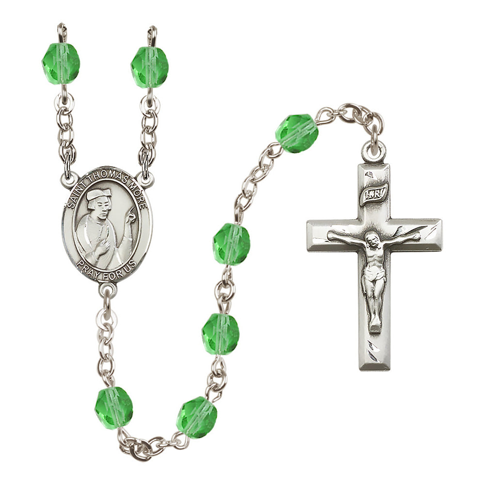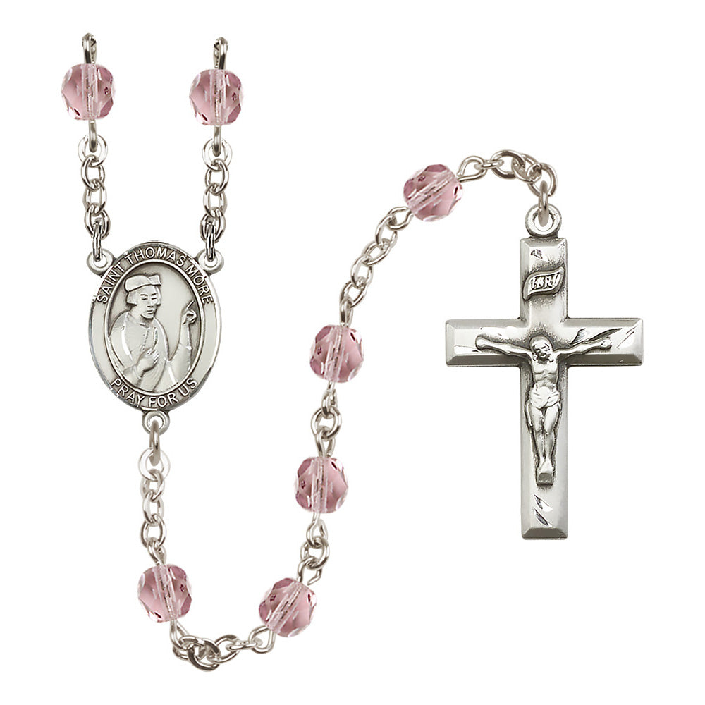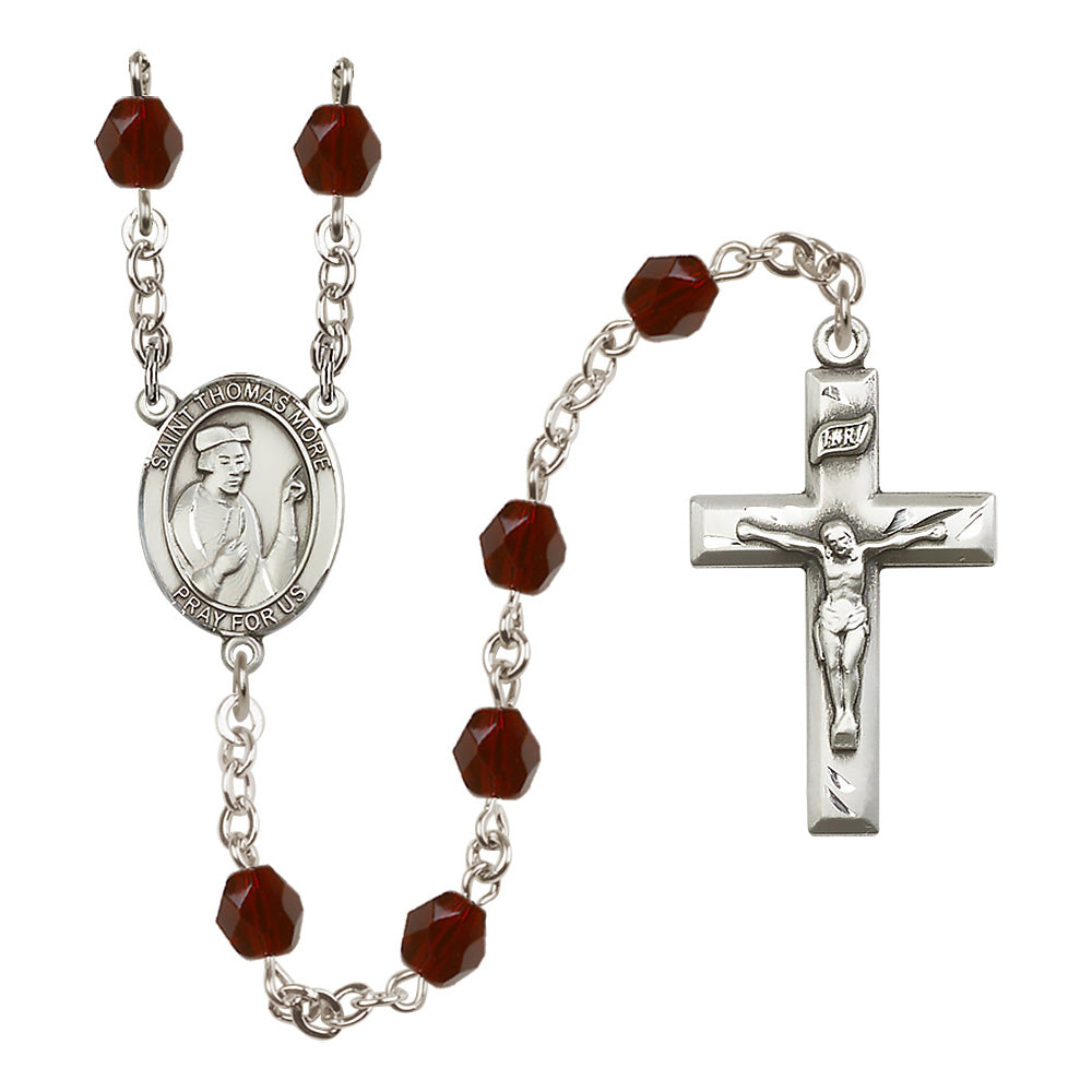 The St. Thomas More Crystal Birthstone Rosary offers a personalized and elegant gift for anyone devoted to this patron saint, particularly lawyers and statesmen. With hand-made craftsmanship in the U.S.A., it features 6mm Czech fire polished beads in your choice of birthstone crystal colors, a bright pewter medal, and rhodium-plated wire to prevent tarnishing. Each rosary is a feminine expression of faith and beauty.