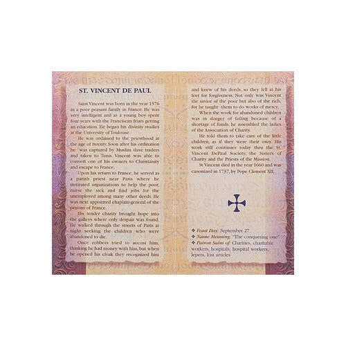 This beautiful St. Vincent de Paul folded, glossy prayer card features gold stamped Italian art on the front cover, a 2 page biography, along with the meaning of his name and his feast day printed on the inside, and a popular prayer of intercession on the back cover. This "Mini Lives of the Saints" prayer card offers readers an artistically crafted, informative reference into the life of St. Vincent de Paul.