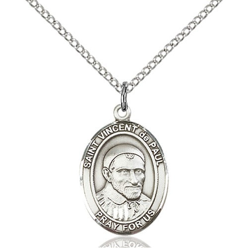 Sterling Silver St. Vincent De Paul Pendant on a Sterling Silver Lite Curb, 18" Chain with clasp. Size: 3/4 x 1/2 inches, Patronage: Charities/Caregivers