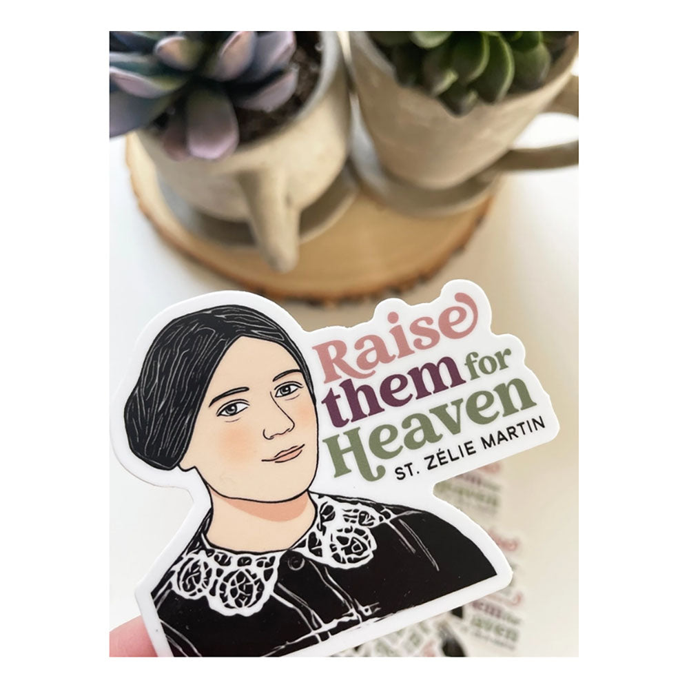 Celebrate your faith and the wisdom of the saints with the St. Zelie Martin "Raise Them For Heaven" vinyl sticker. This colorful and uplifting sticker is perfect for adorning your notebook, laptop, or water bottle, reminding you of St. Zelie Martin's devotion and inspiration in parenting. Durable and waterproof, this unique gift is made in the USA. Measures 2.5" x 3".