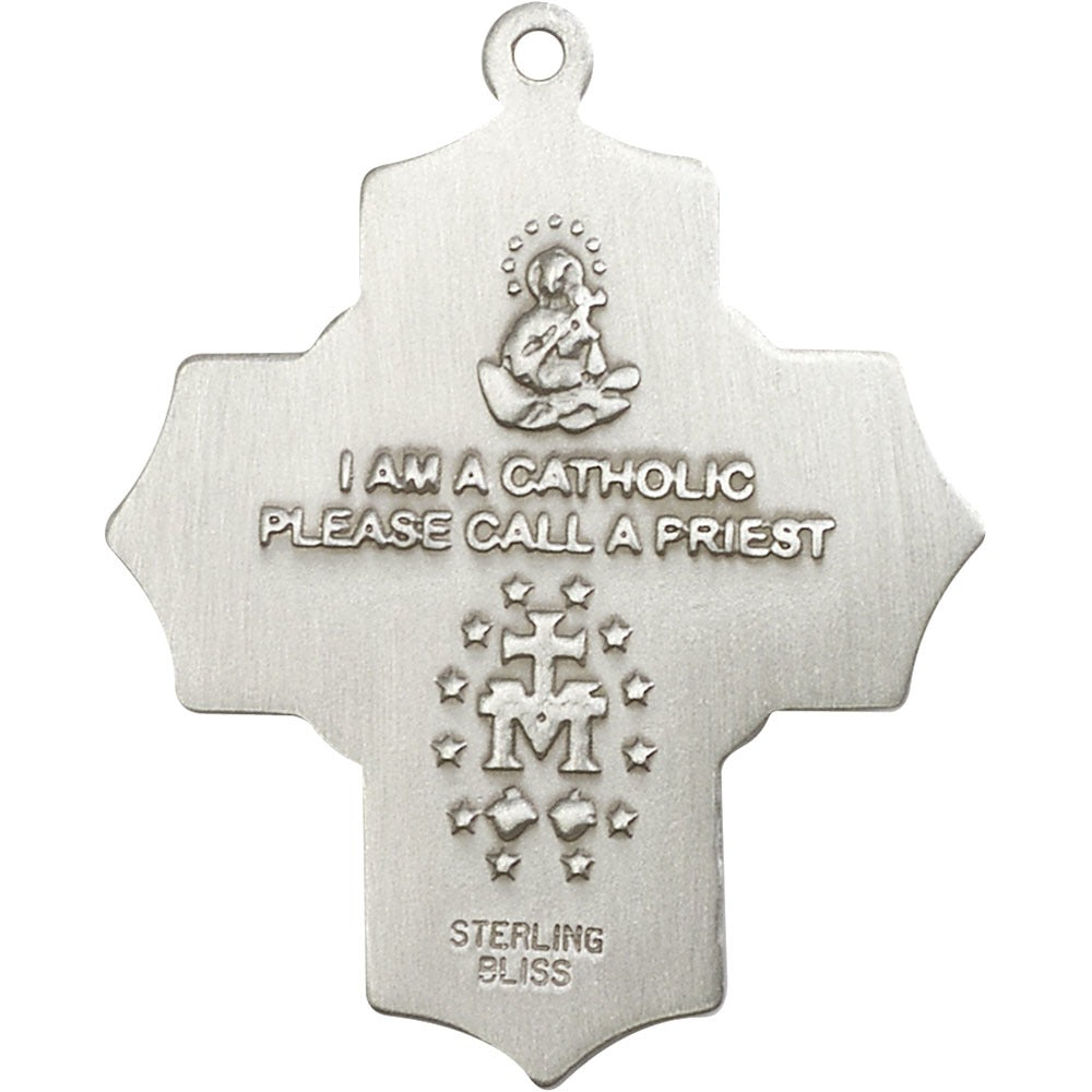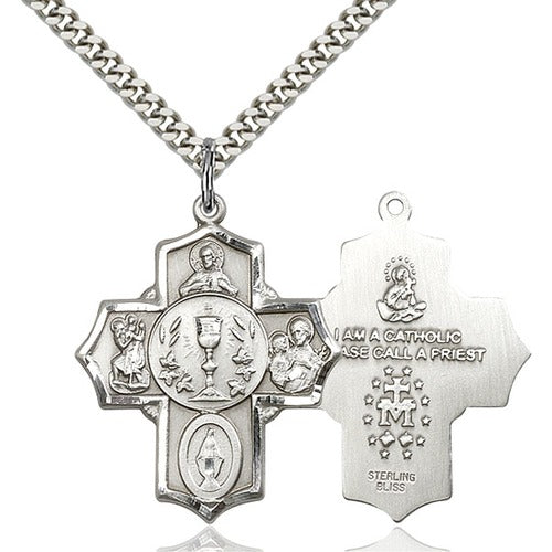 The Sterling Silver 5-Way Pendant features a hand-made design on a 24" light rhodium heavy curb chain, crafted in the USA. Measuring 1 1/4 x 1 inches, this pendant combines elegance and durability, offering a guaranteed tarnish-resistant finish. Perfect for expressing faith with timeless style.