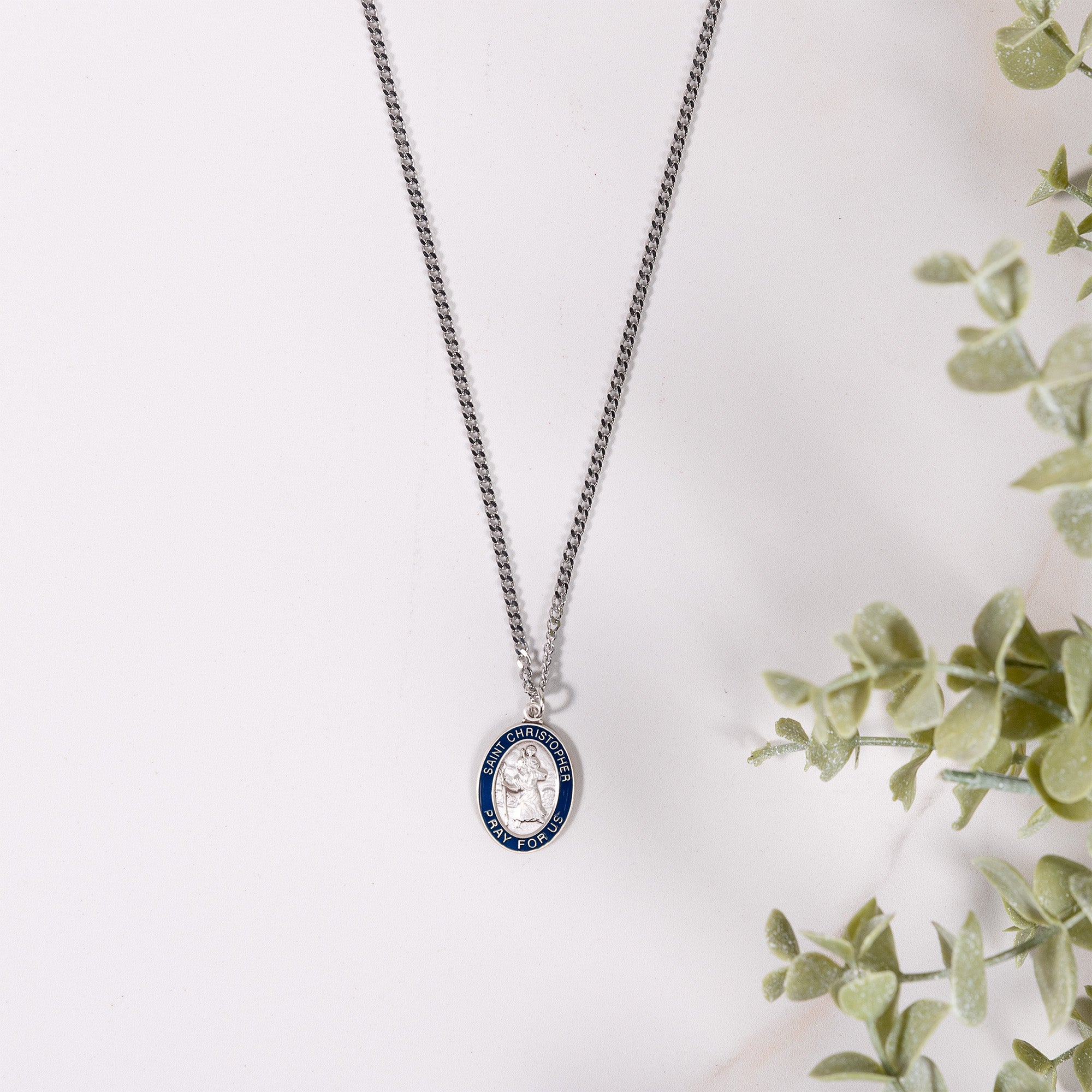 Sterling Silver & Blue Enamel St. Christopher Medal Necklace