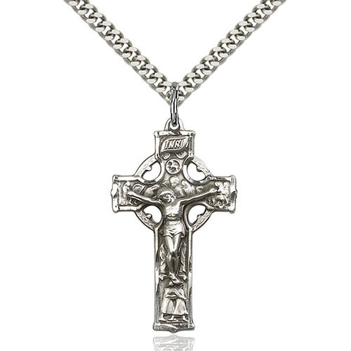 The Sterling Silver Celtic Crucifix Pendant elegantly blends tradition with craftsmanship. Featuring a 1 3/8 x 3/4 inch design, it hangs on a 24" light rhodium heavy curb chain. Hand-made in the U.S.A., this piece is guaranteed not to tarnish, making it a lasting symbol of faith and heritage.