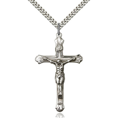 This Sterling Silver Crucifix Pendant, measuring 1 3/4 x 1 inch, is elegantly displayed on a 24" light rhodium curb chain with a secure clasp. Handcrafted in the USA, this piece promises durability and radiance, guaranteed not to tarnish. A perfect blend of faith and craftsmanship.