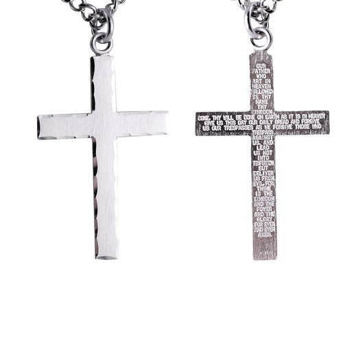 This sterling silver Engraved Cross with the "Lords Prayer" on back measures 1.68 long and comes with a 24" rhodium plated stainless steel chain with clasp.