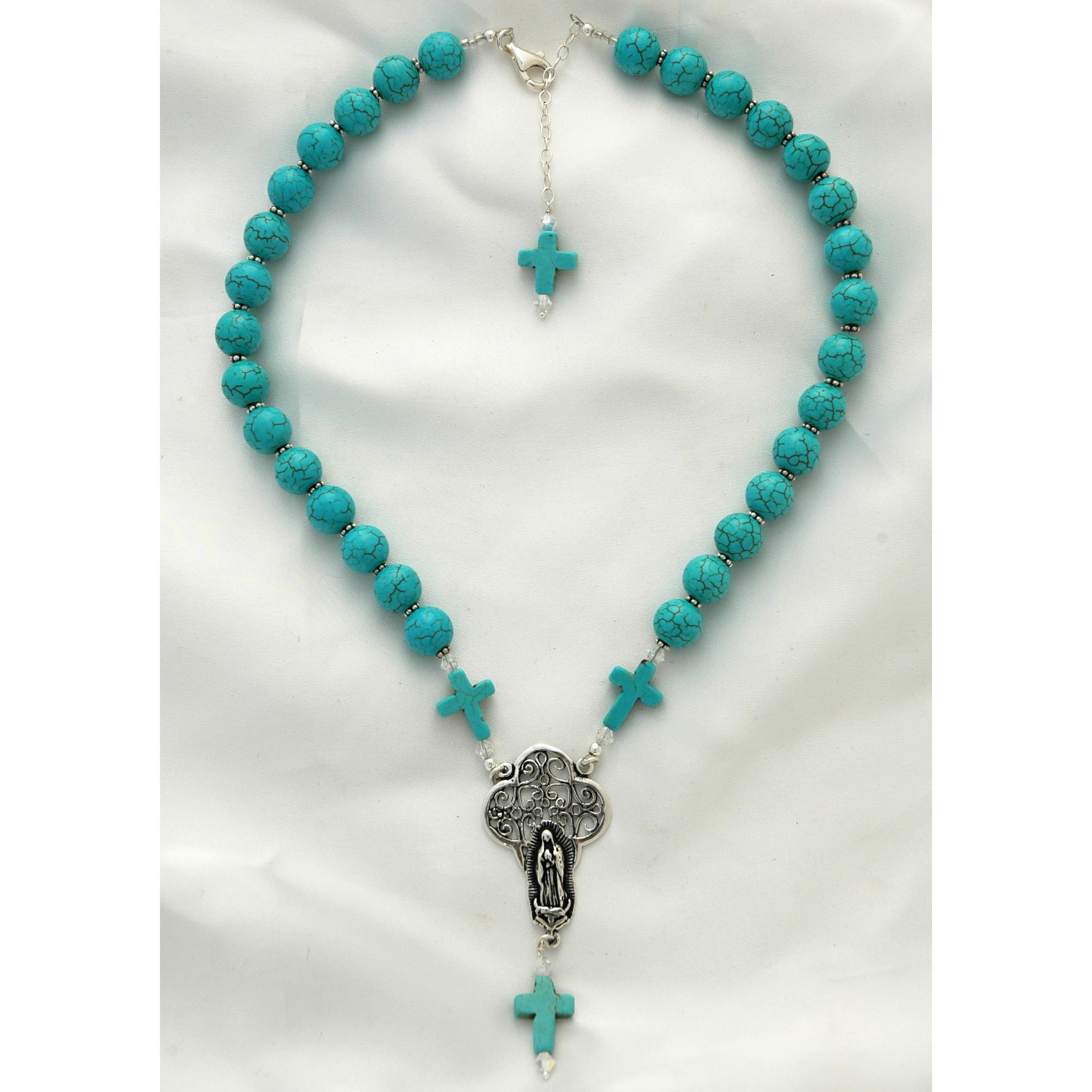 Faith and fashion unite in this artfully crafted Our Lady of Guadalupe turquoise and sterling silver necklace. Stylish yet graceful, this stunning necklace features 10mm genuine turquoise stones, crystal beads, and sterling silver accents. Turquoise crosses adorn the rich, classic design. Handcrafted in the Southwest region of the USA. Part of the CRA collection. Turquoise and silver lends a timeless look with an everlasting sentiment. This item will ship separately from other items in your order.