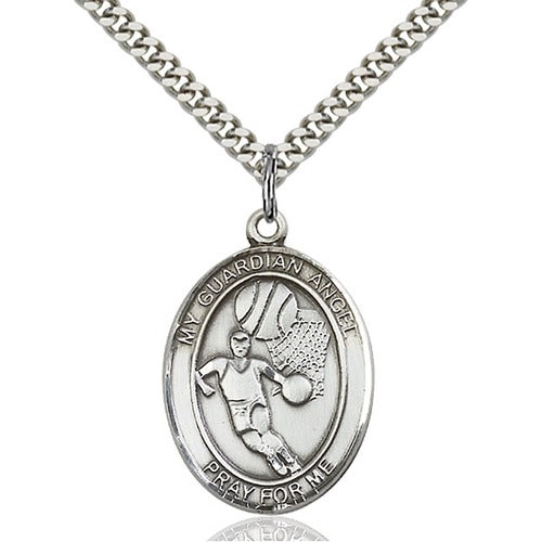 The Sterling Silver Guardian Angel/Basketball Pendant is a perfect gift for devoted athletes. Handcrafted by U.S. artisans, this durable medal comes with a 24" light rhodium curb chain and a lifetime guarantee against tarnishing. Its thoughtful design ensures it will be cherished by its wearer.