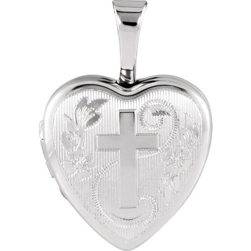 The Sterling Silver Heart Locket with Cross from the Stuller religious jewelry line features exquisite craftsmanship, designed to hold two pictures. Measuring 12.5 mm x 12 mm and weighing 1.4 grams, this elegant locket charm beautifully showcases faith. Please note the chain is not included, and pricing may vary with metal rates.