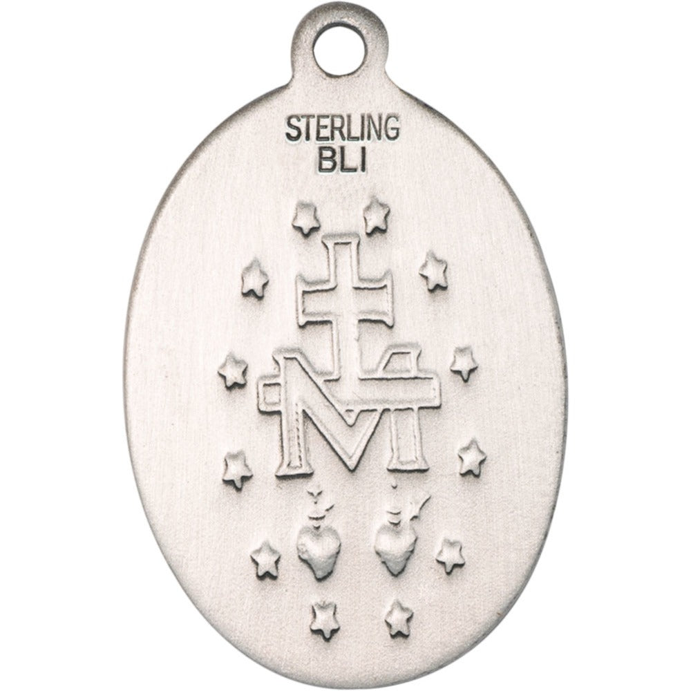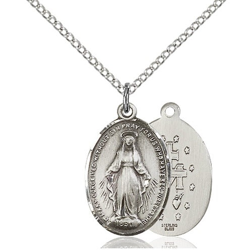 This exquisite Sterling Silver Miraculous Pendant features a classic design on a durable 18" lite curb chain. Hand-made in the USA, the pendant measures 3/4 x 1/2 inches and is guaranteed not to tarnish, ensuring lasting beauty and elegance. Perfect for adding a touch of faith to any outfit.