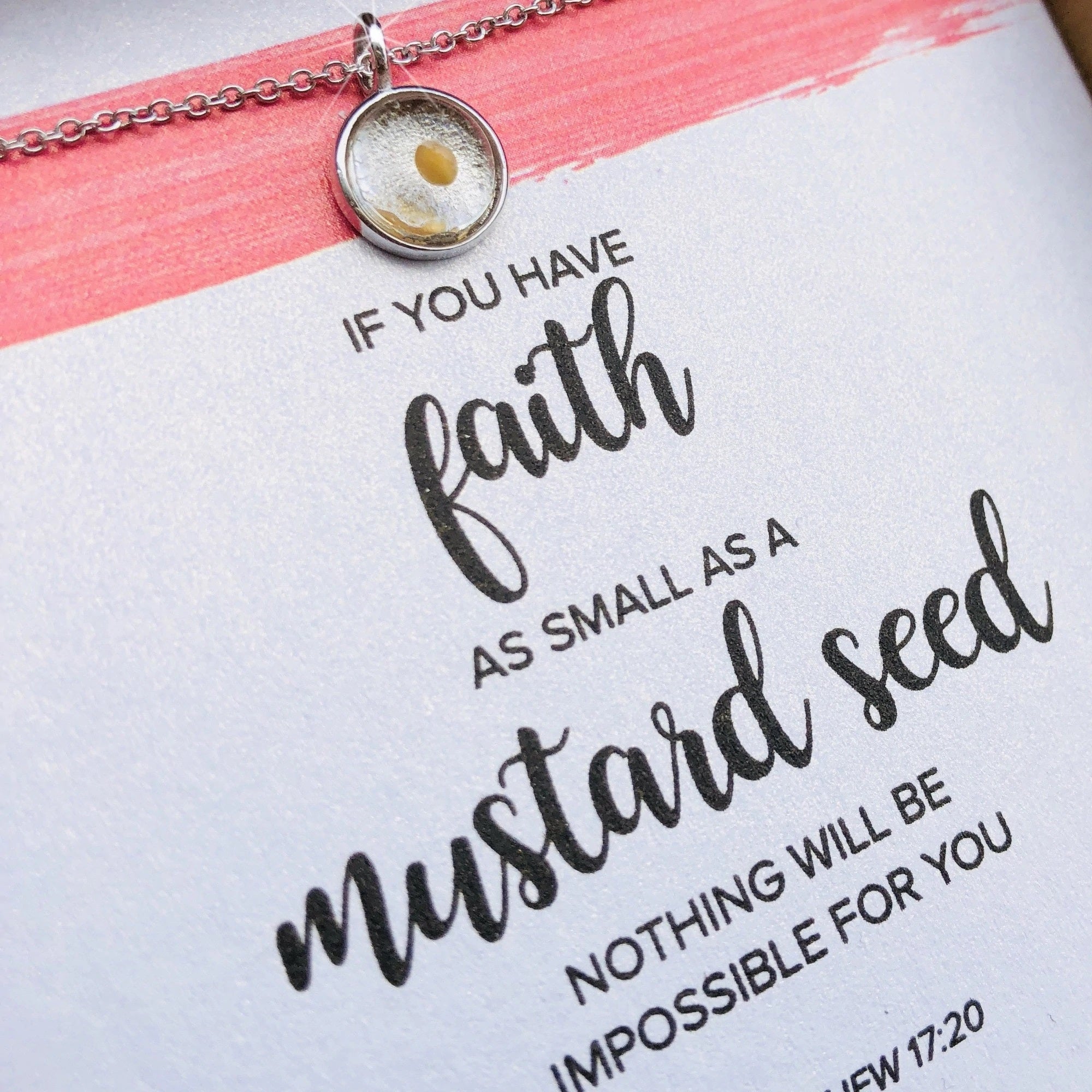 The Lord said, "If you have faith as small as a mustard seed, nothing will be impossible for you," (Matthew 17:20). Sometimes, we just need to be reminded. Wear this pretty necklace to remind you that God will meet you where you are if you reach out in faith. The tiny mustard seed is enclosed in a glass dome pendant and dangles from a sterling silver chain. This is a fun and faithful piece for your jewelry collection and a statement of your faith and trust in God. Perfect for girls, teens and young women and a wonderful Sacramental gift or addition to her jewelry collection. Mounted on an inspirational card featuring the bible verse.