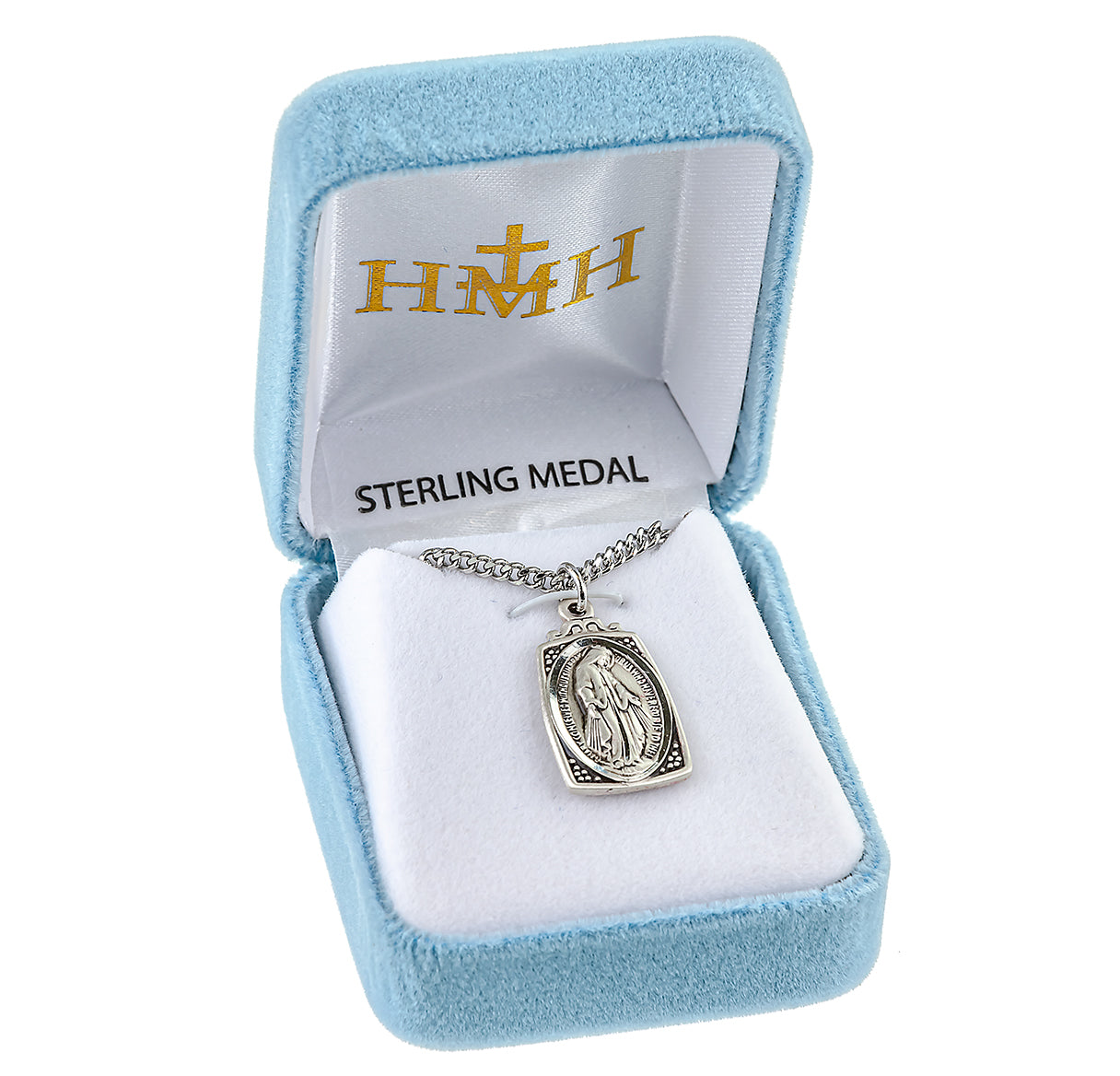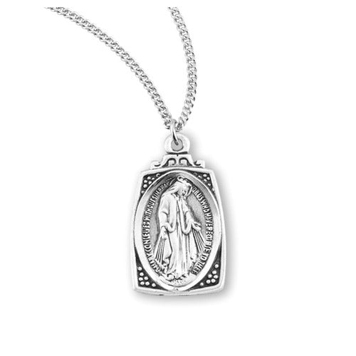 This Sterling Silver Profile Miraculous Medal Necklace offers a unique and stunning display of Marian devotion. Featuring Our Lady's profile within a rectangle resembling a starry night, it dangles from a durable surgical steel chain. Presented in a deluxe velvet gift box, this sophisticated, eye-catching piece is ideal for women of all ages. Medal size: 0.9" x 0.5", Chain length: 18".