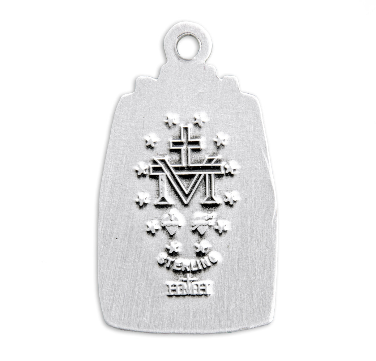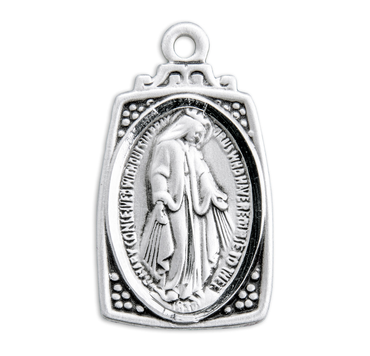 This unique miraculous medal is a gorgeous display of Marian piety. The image of Our Lady highlights her profile and her downward gaze, while the rectangular border resembles a starry night sky. The medal hangs on a surgical steel stainless curb chain for ease of care and shine. An eye-catching yet sophisticated design sure to be treasured by women of all ages. Gift boxed for presentation.