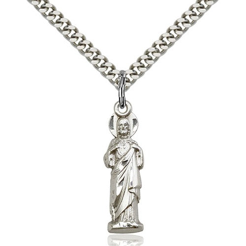 This Sterling Silver Sacred Heart Pendant, handcrafted by U.S. artisans, offers a unique and traditional design. Measuring 1 x 1/4 inches, it features rich detailing and is guaranteed for life. Paired with a 24" light rhodium curb chain, it promises to never tarnish, making it a cherished keepsake.