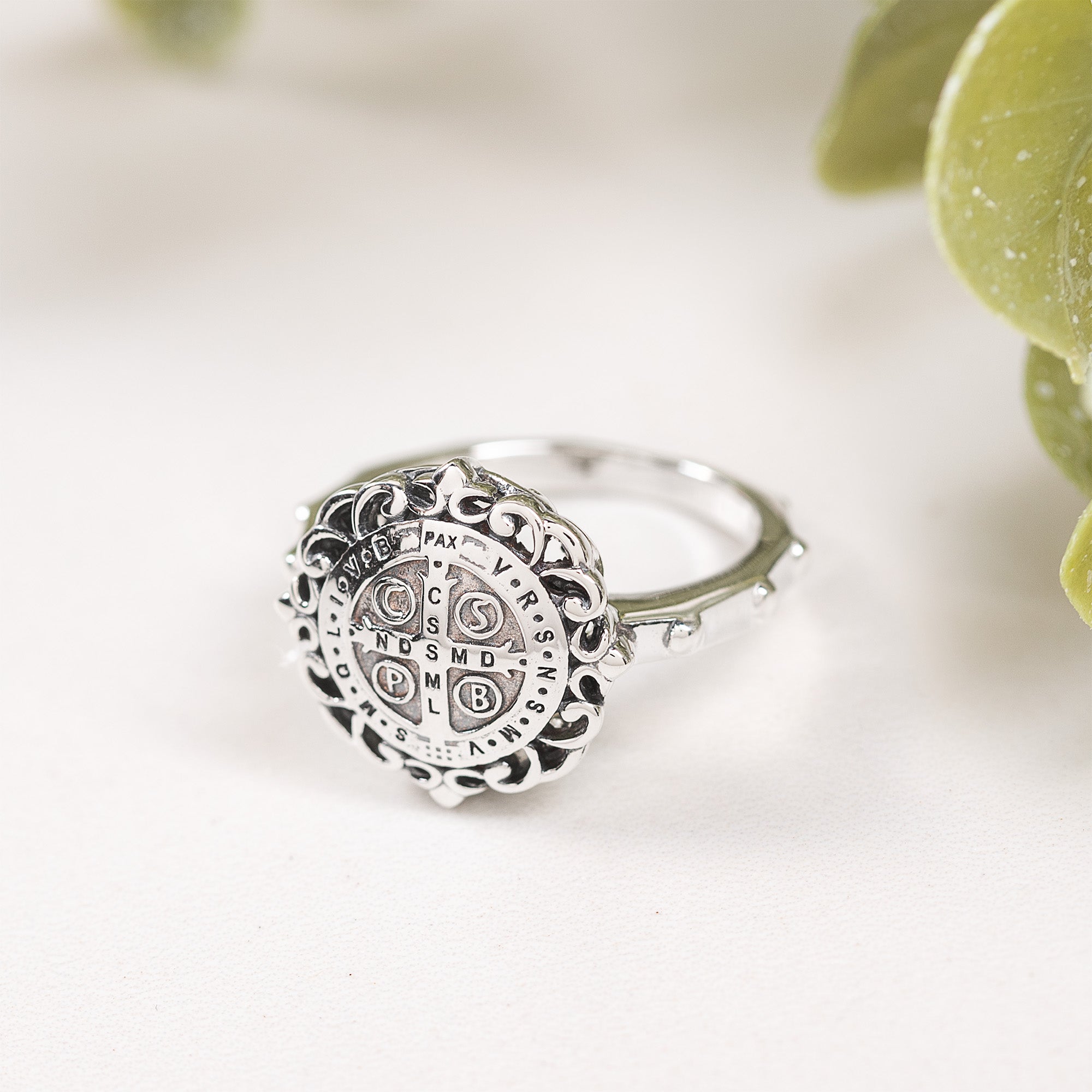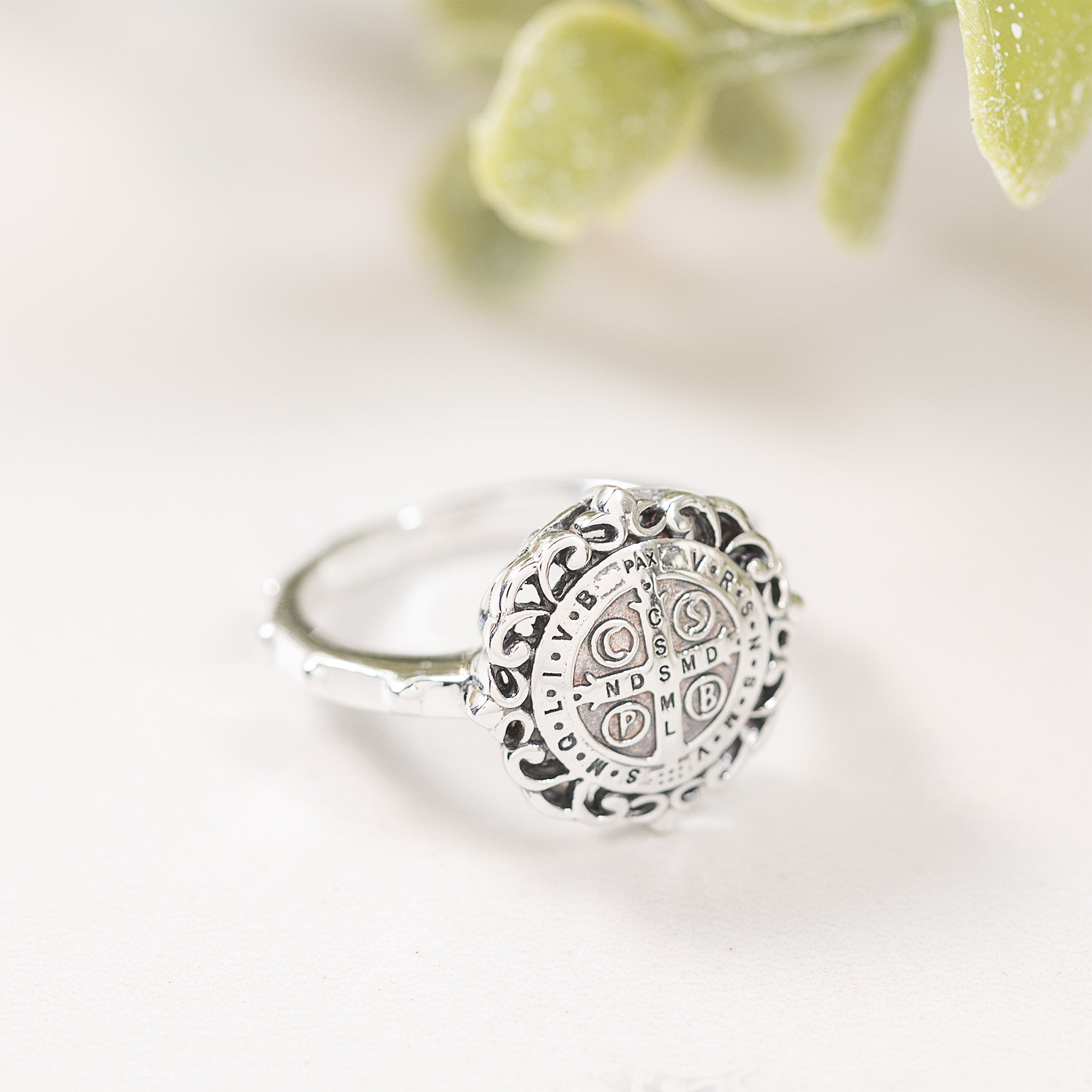 It features a sterling silver St. Benedict Jubilee Medal centerpiece, inside an intricate filigree setting made with fine detailing and graceful design. Around the outer edges of the ring are small bumps she can use as “beads" to count her rosary prayers. They are slight and discrete, comfortable yet decorative and useful.