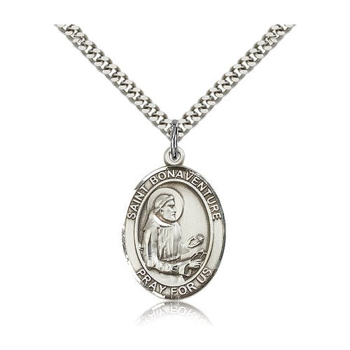 Sterling Silver St. Bonaventure Pendant on a 24'' Light Rhodium Heavy Curb Chain with clasp. Size: 1 x 3/4 inches.