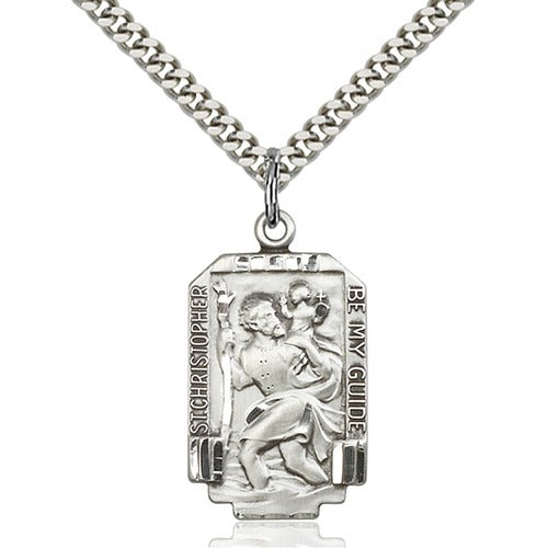 This Sterling Silver St. Christopher Pendant, patron saint of travelers and motorists, is beautifully crafted and comes on a 24" light rhodium heavy curb chain with a clasp. Measuring 1 x 5/8 inches, it's handmade in the USA and guaranteed to not tarnish, making it a perfect gift or personal keepsake.