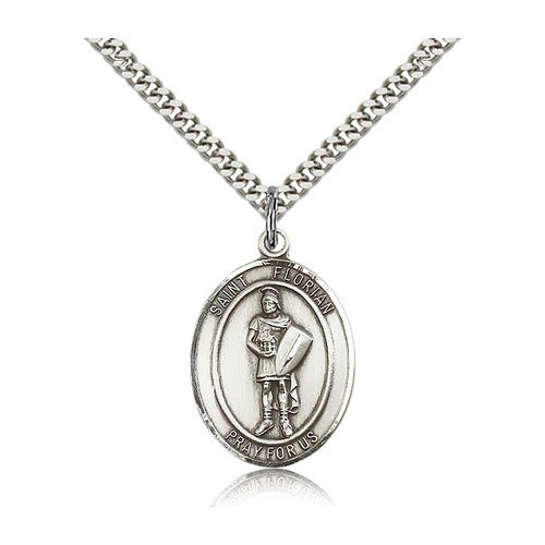 Sterling Silver St. Florian Pendant on a 24" Light Rhodium Heavy Curb Chain with clasp. Size: 1 x 3/4. Patronage: Fire Fighters. Made in the USA.