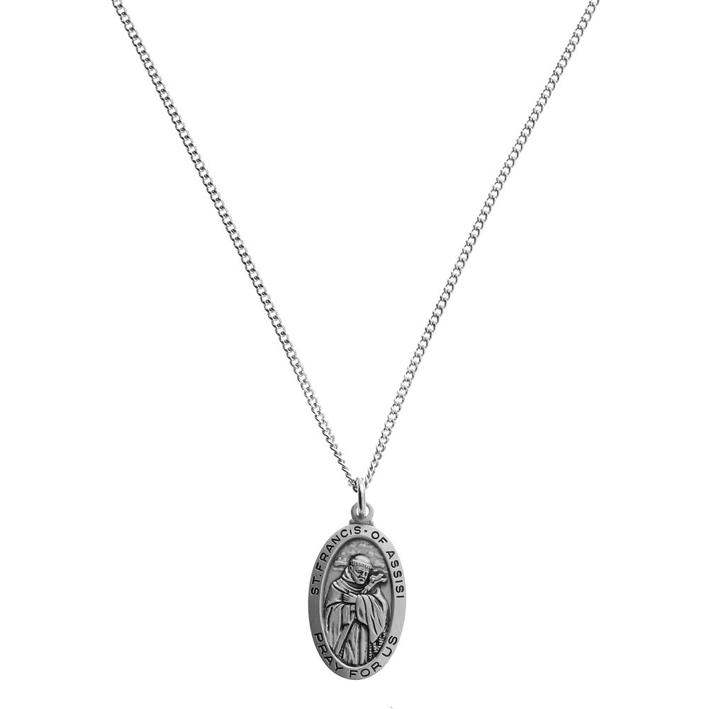 This sterling silver St. Francis medal measures 1 9/16" long and comes with a 18" rhodium plated chain and Gift box.