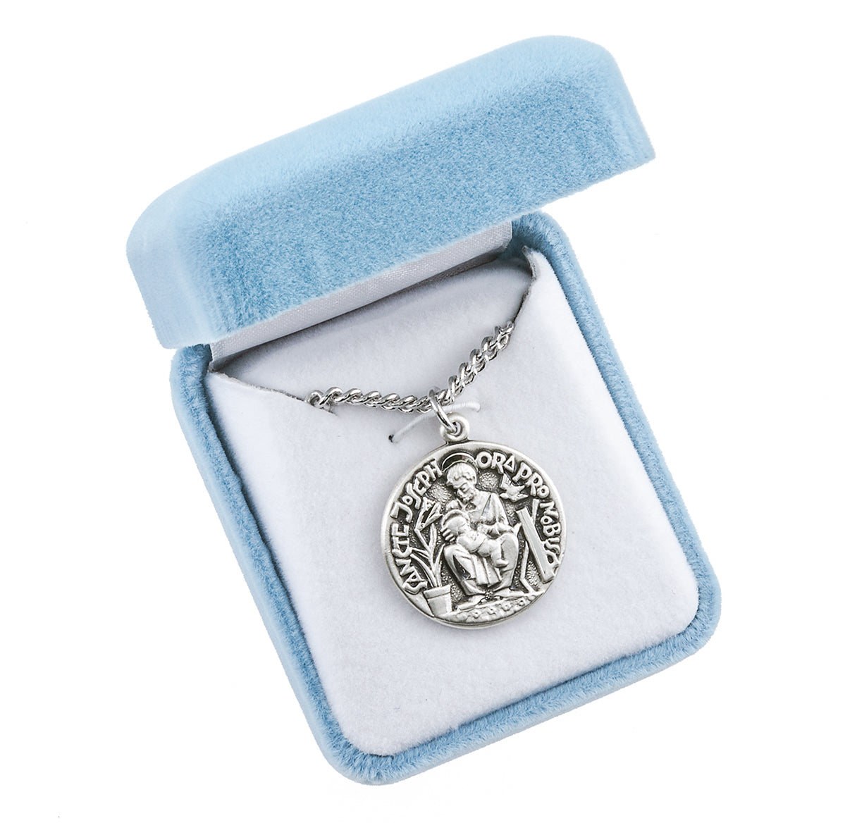 The Sterling Silver St. Joseph Medal Necklace features a distinctive design with St. Joseph holding the Christ Child in a masculine, angular style. Crafted with a durable stainless steel chain and sterling silver medal, it offers ease of care. This unique piece is an ideal gift for fathers, grandfathers, or anyone devoted to St. Joseph, symbolizing powerful protection. Presented in a gift box, it makes a thoughtful present.