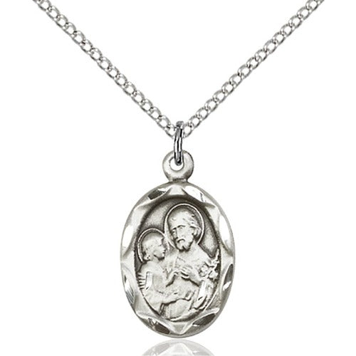 This hand-made Sterling Silver St. Joseph Pendant is designed for those seeking divine patronage for carpenters, the dying, and fathers. Measuring 3/4 x 3/8 inches, it comes on an 18" sterling silver lite curb chain with a clasp. Crafted in the U.S.A., this piece is guaranteed to not tarnish, offering lasting spiritual significance and elegance.