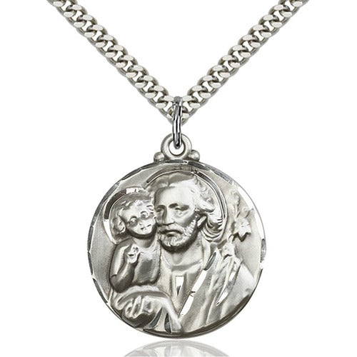 This exquisite Sterling Silver St. Joseph Pendant honors the patron of carpenters, fathers, and the dying. It features a durable 24" light rhodium heavy curb chain with a secure clasp. Hand-made in the U.S.A., the pendant measures 1 1/8" x 7/8" and is guaranteed to resist tarnishing, making it a lasting symbol of faith and devotion.