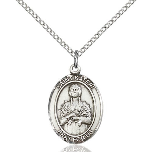 Sterling Silver St. Kateri Pendant on an 18" Sterling Silver Lite Curb Chain. Size: 3/4 x 1/2. Patronage: Environment.