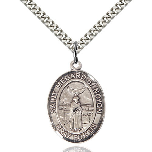 Sterling Silver St. Medard of Noyon Pendant on a 24 inch Light Rhodium Curb, 24" Chain with clasp. Size: 1 x 3/4 inches, Patronage: Good Weather