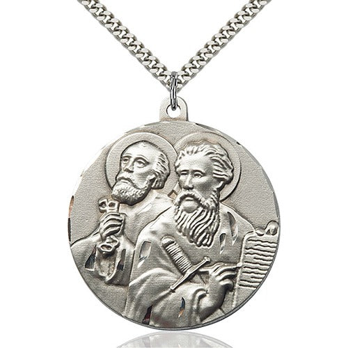 The Sterling Silver St. Peter/St. Paul Pendant offers a sophisticated tribute, elegantly crafted and paired with a 24-inch light rhodium curb chain. Measuring 1 5/8" x 1 1/2", this handmade piece is proudly made in the USA and is guaranteed to resist tarnish, ensuring timeless elegance for your devotion.