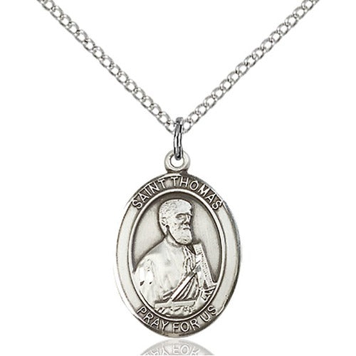This elegant Sterling Silver St. Thomas the Apostle Pendant honors the patron saint of architects and blind people. Featuring a 3/4 x 1/2 inch design, it hangs on an 18" Sterling Silver Lite Curb Chain with a clasp. Proudly hand-made in the U.S.A., it's guaranteed to resist tarnishing, making it a cherished keepsake of faith and devotion.