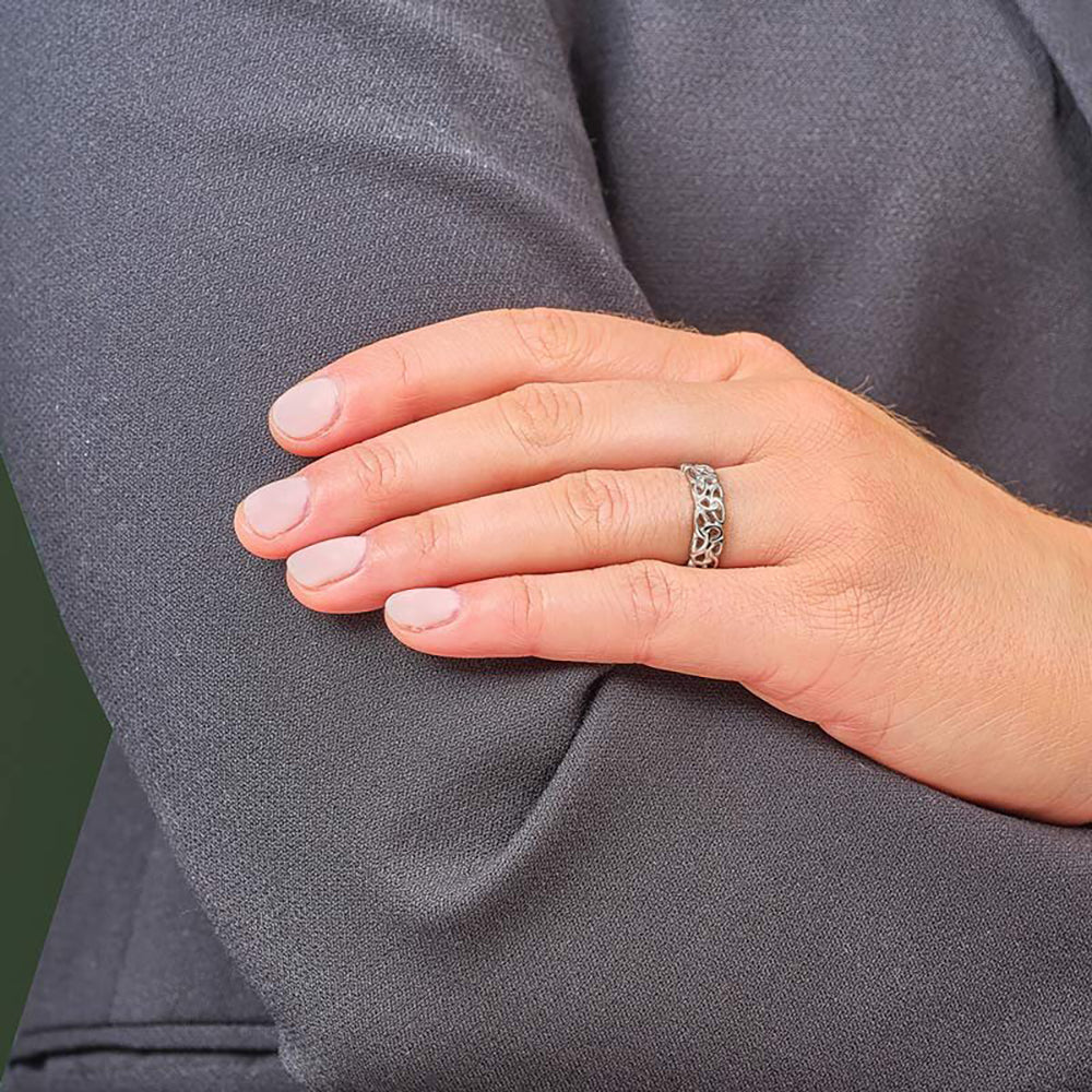 This elegant Sterling Silver Trinity Knot Filigree Ring features intricate entwined Trinity Knots in a striking cutout design. A perfect blend of faith and Irish heritage, it's an ideal gift for Confirmation, RCIA, or any occasion. Available in multiple sizes and presented in a hinged gift box, it's a distinctive piece for everyday or formal wear. Hallmarked by the Assay Office at Dublin Castle.