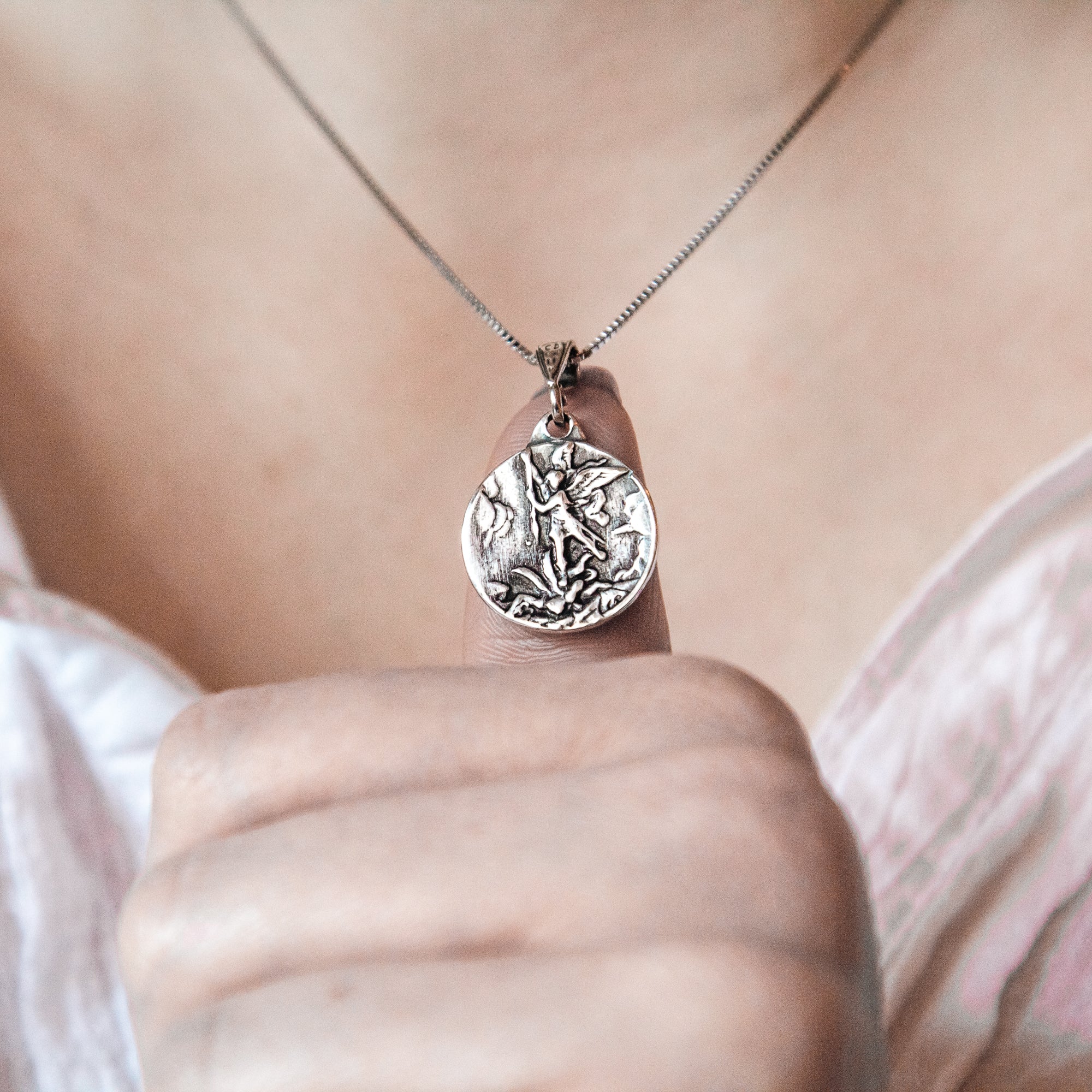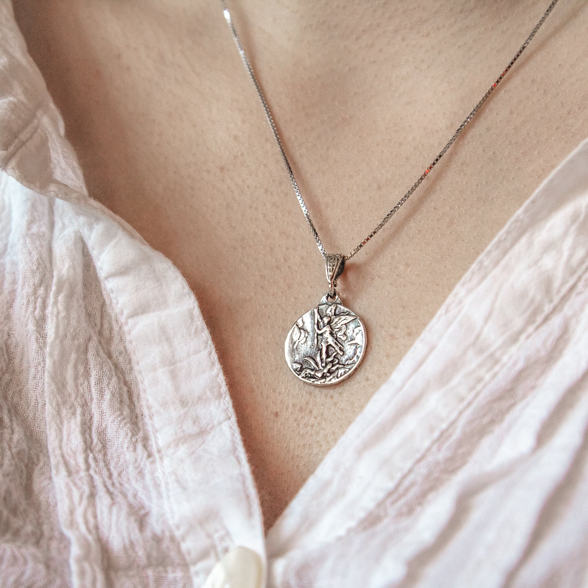 The Sterling St. Michael Vintage Medal Necklace is a graceful statement of faith and protection, featuring a beautifully detailed sterling silver St. Michael medal on an 18" chain. As a timeless and distinctive heirloom piece made in the USA, it comes gift-boxed, making it a perfect, thoughtful gift. Bless it for added sacramental power.