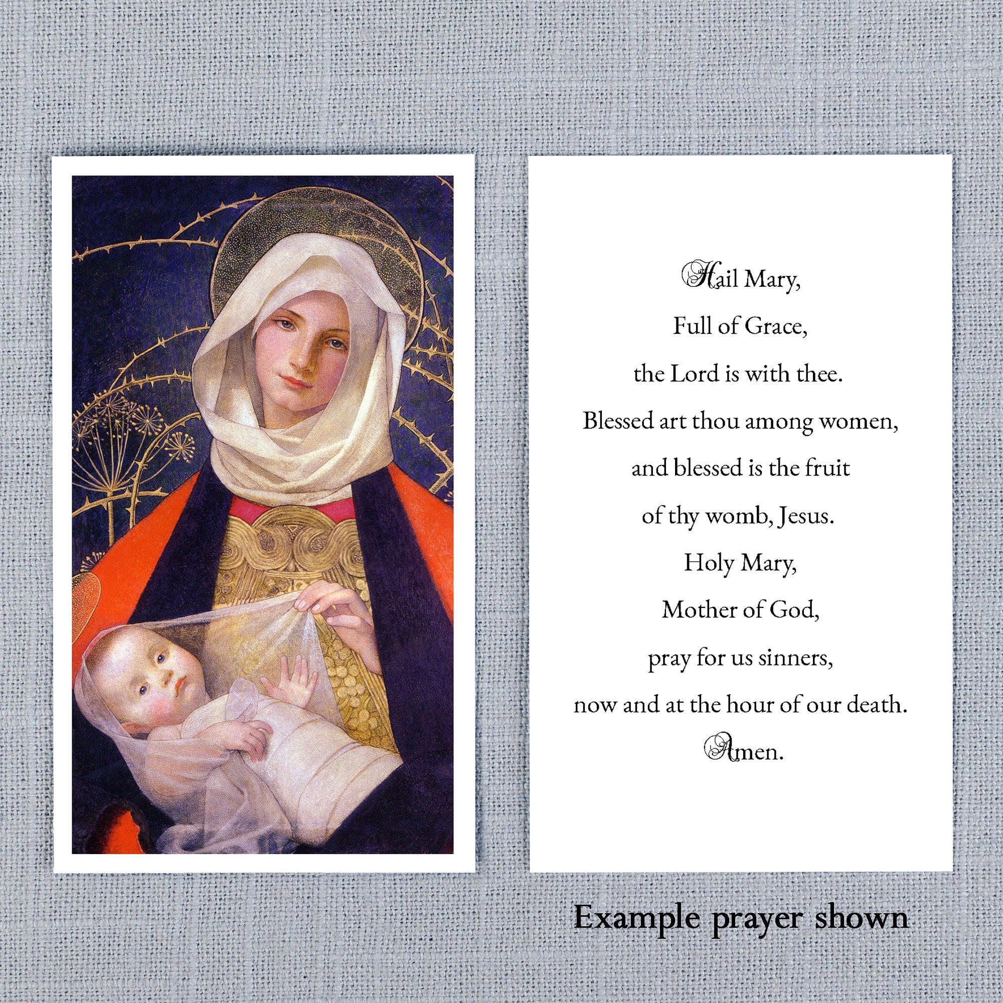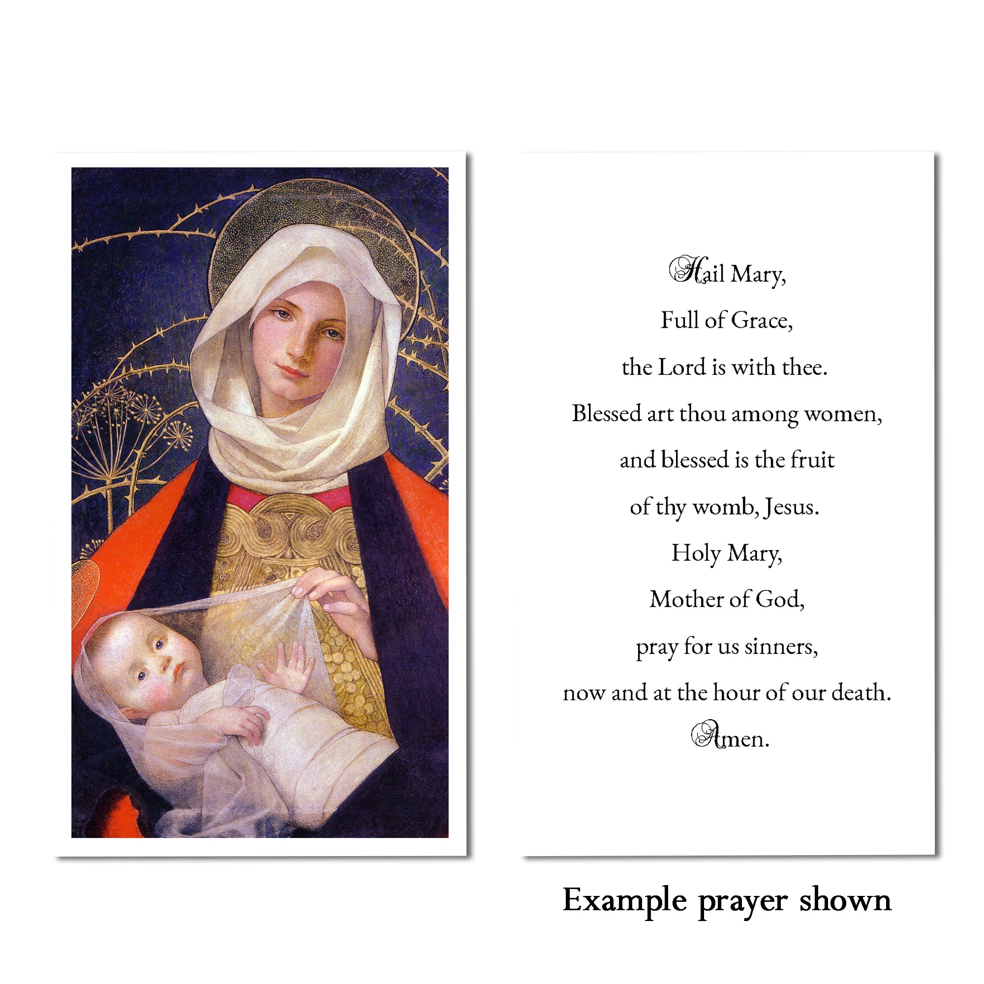 This lovely prayer card features the renowned Madonna and Child piece by Marianne Stokes, with the text of the Hail Mary on the reverse side. A simple, thoughtful gift of prayer and reflection on holy innocence. Slip into a card for a friend or keep in your purse or favorite prayer book.