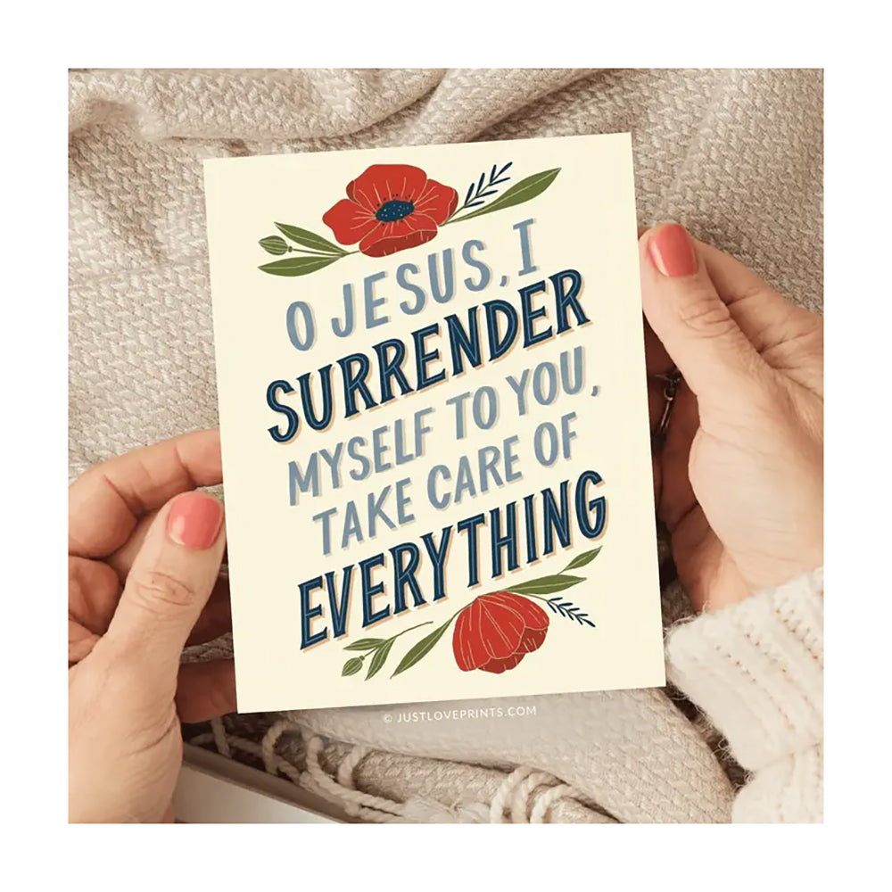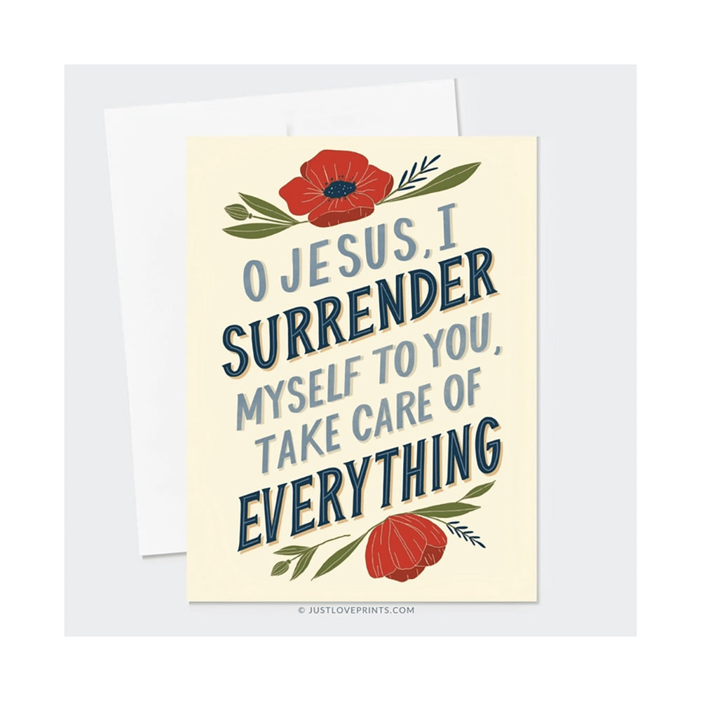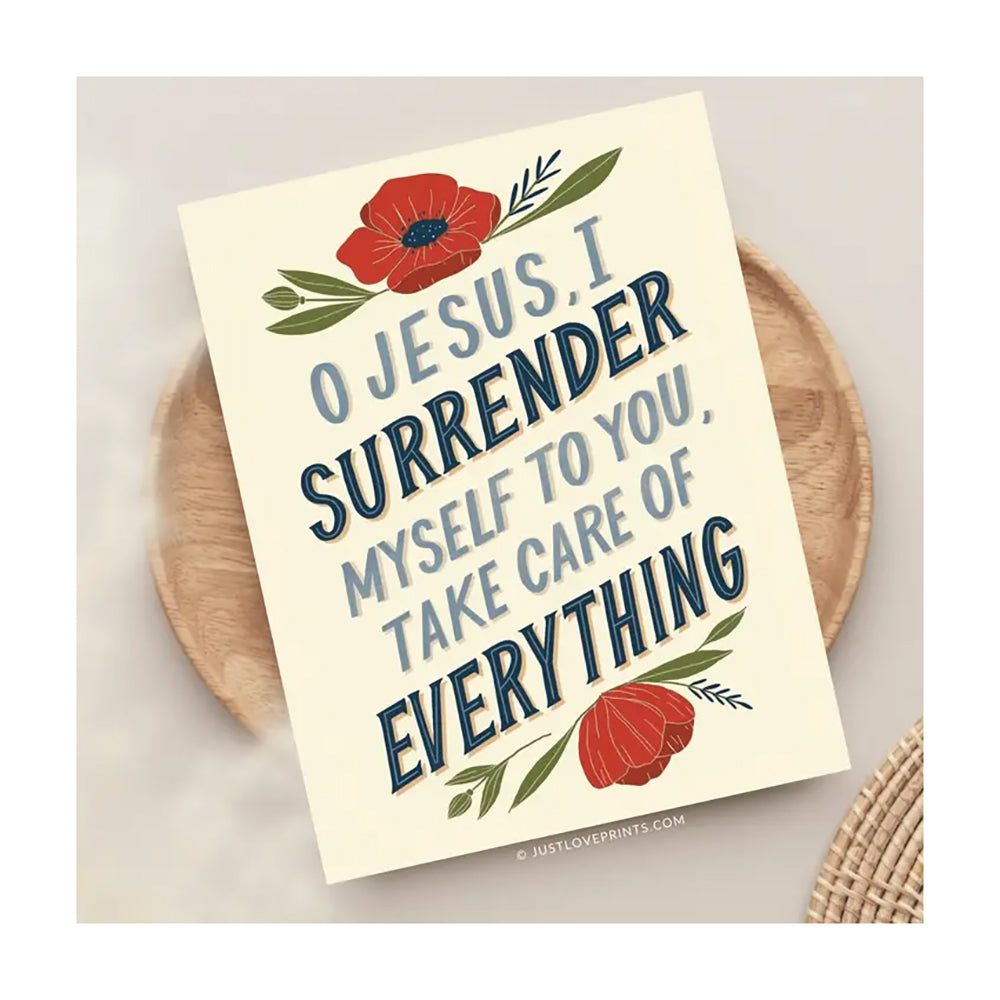 This vibrant greeting card, adorned with floral imagery and stylized text, features a powerful quote from the Surrender Novena: "O Jesus, I surrender myself to You. Take care of everything!" Offering encouragement to those facing struggles, the card is blank inside for your personal message and includes a matching white envelope. Made in the USA, it measures 4.25" x 5.5".