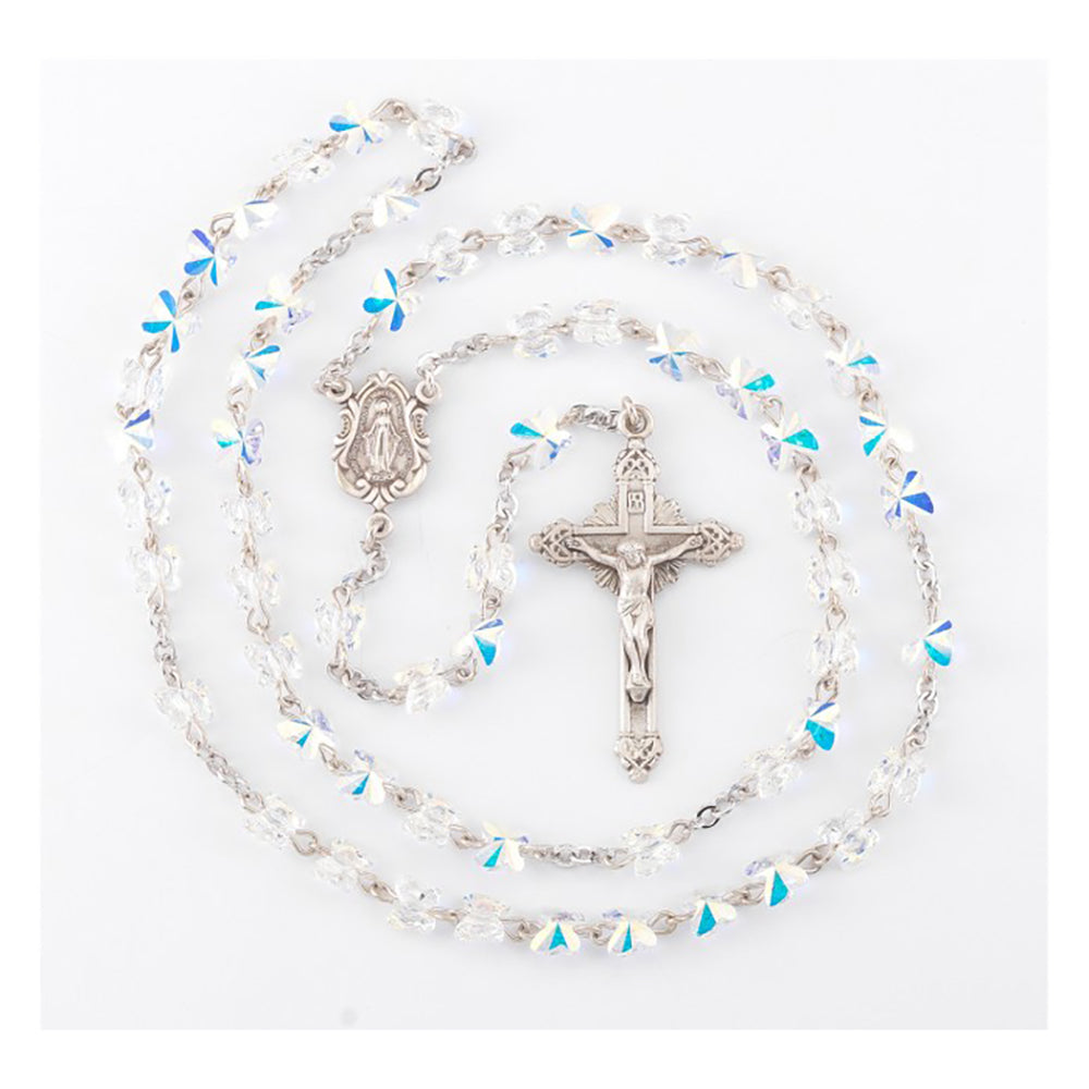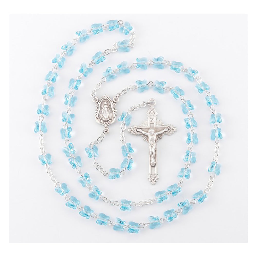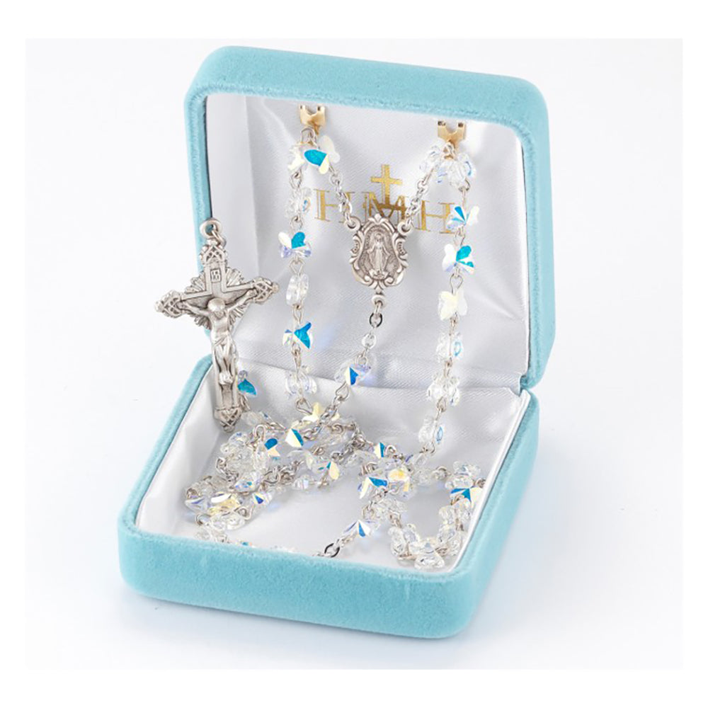 The Swarovski Crystal Butterfly Rosary offers a stunning display of Austria's finest butterfly beads in clear, pink, or blue. With an ornate sterling Crucifix and Miraculous Medal, this rosary serves as an exquisite heirloom or special sacramental gift. Crafted with Aurora Borealis crystals, it comes in a deluxe velvet box, making it an ideal keepsake for cherished occasions. Made in the USA.