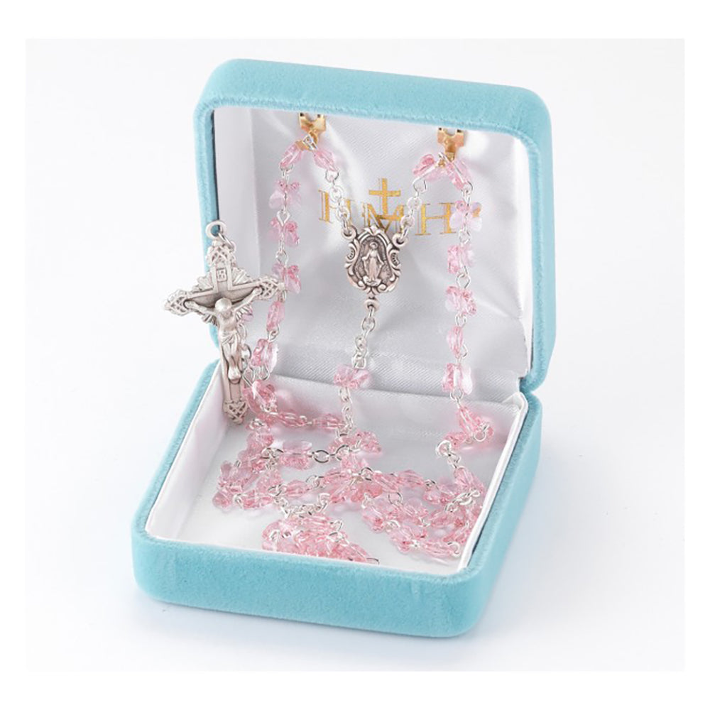 An heirloom rosary and a distinctive gift of love and prayer in Clear, Pink, or Blue beads, it could be a special sacramental gift, Baptism gift, or a rosary for someone you cherish on any occasion. Deluxe velvet gift boxed and made in the USA.