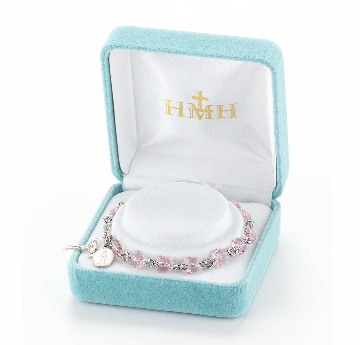 We love this girl's rosary bracelet!  Elegant in style, this lovely rose pink rosary bracelet will delight any young girl.  With tiny pink butterflies as the rosary beads, this simple yet delightfully charming girl's rosary bracelet will remind its wearer of the resurrection of Our Lord, as the butterfly has long been a symbol of the transformation which takes place within us through Christ’s redemption.  This Swarovski Rose Butterfly Rosary Bracelet is a delightful gift option for a young girl at Christmas, First Communion, Easter, or birthday.
