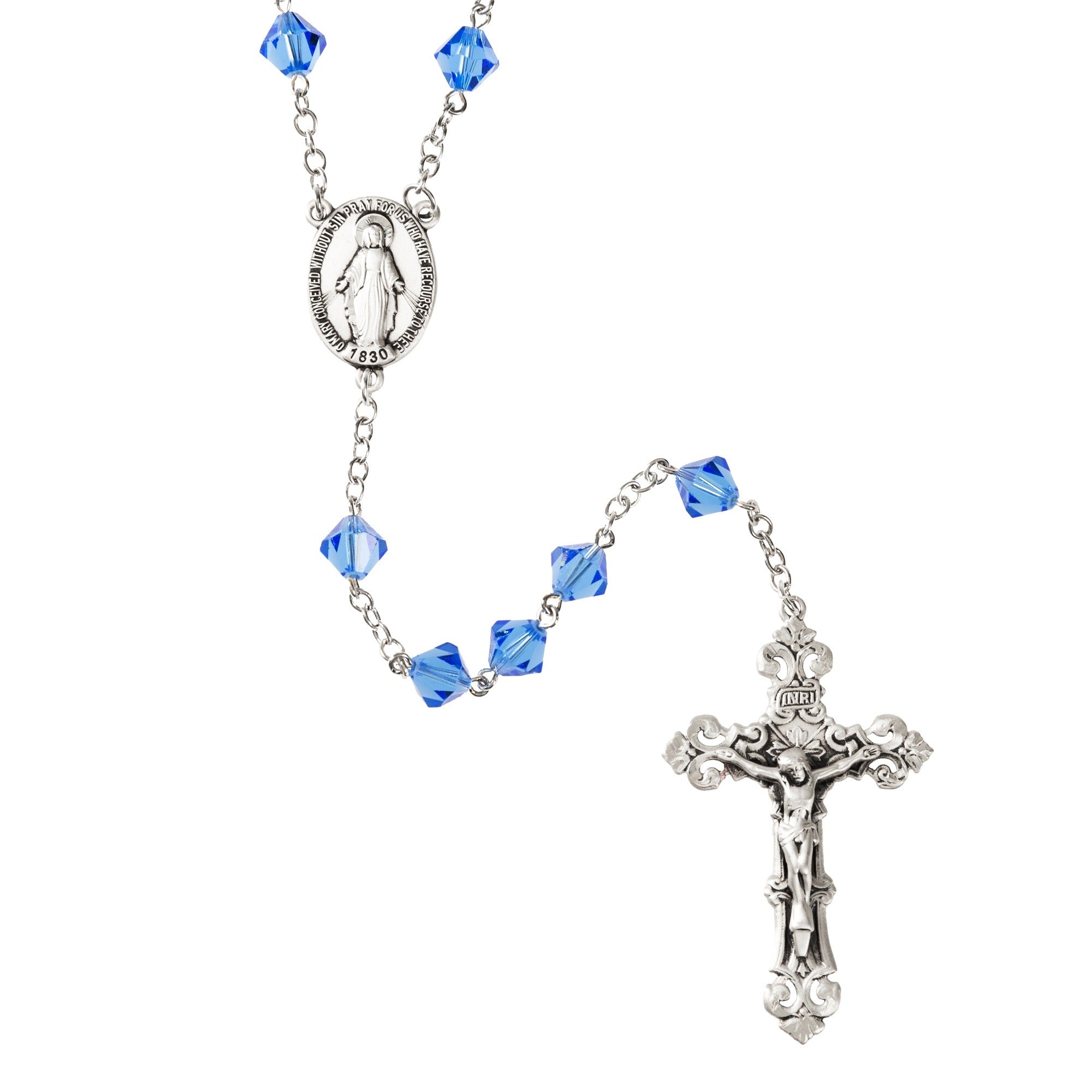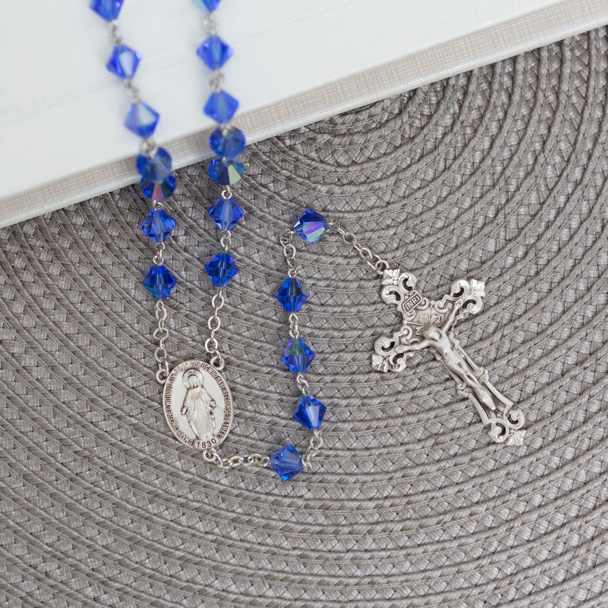 The rondelle Swarovski crystals in this rosary may be sapphire, Marian blue, or the hue of the heavenly sky, but one thing is certain: they are timeless elegance and trademarked quality that Swarovski has perfected for five generations. The rosary is sterling silver, with a Miraculous Medal centerpiece and an ornate baroque Crucifix. An heirloom quality gift of elegance and distinction, as special as the woman who prays with it. Deluxe gift boxed.