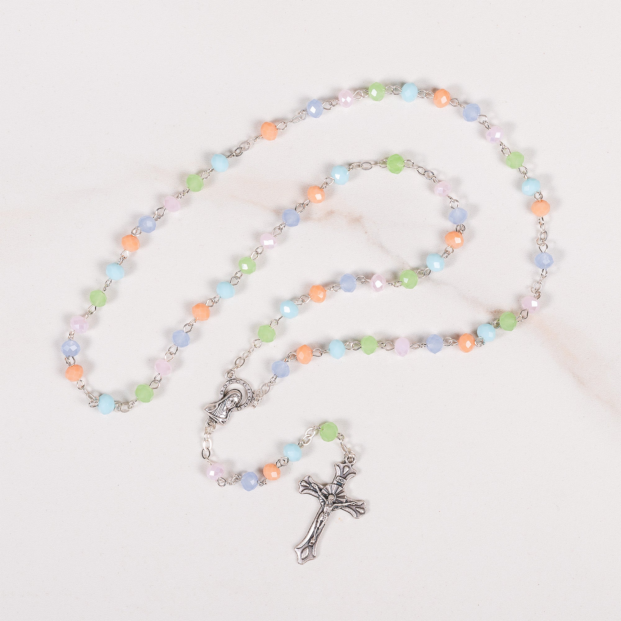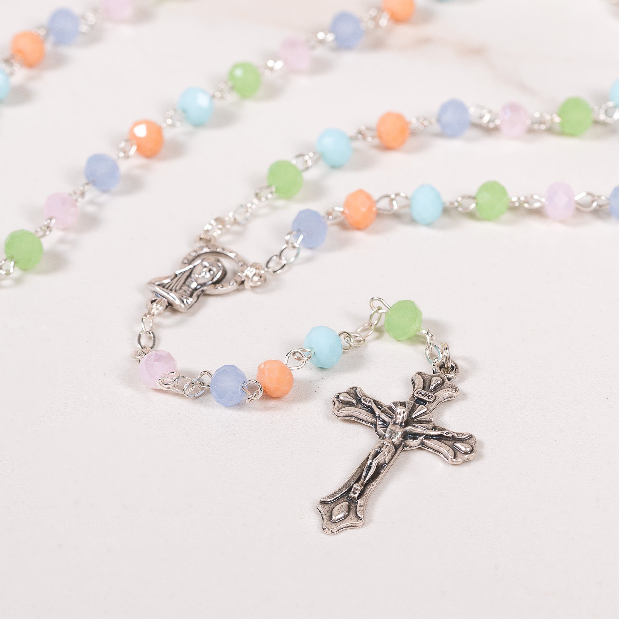 A lovely array of smooth, round, glass beads in a variety of pretty colors that remind us of the sweetest sorbet, this is a rosary for women and girls of all ages and a special gift for any occasion.