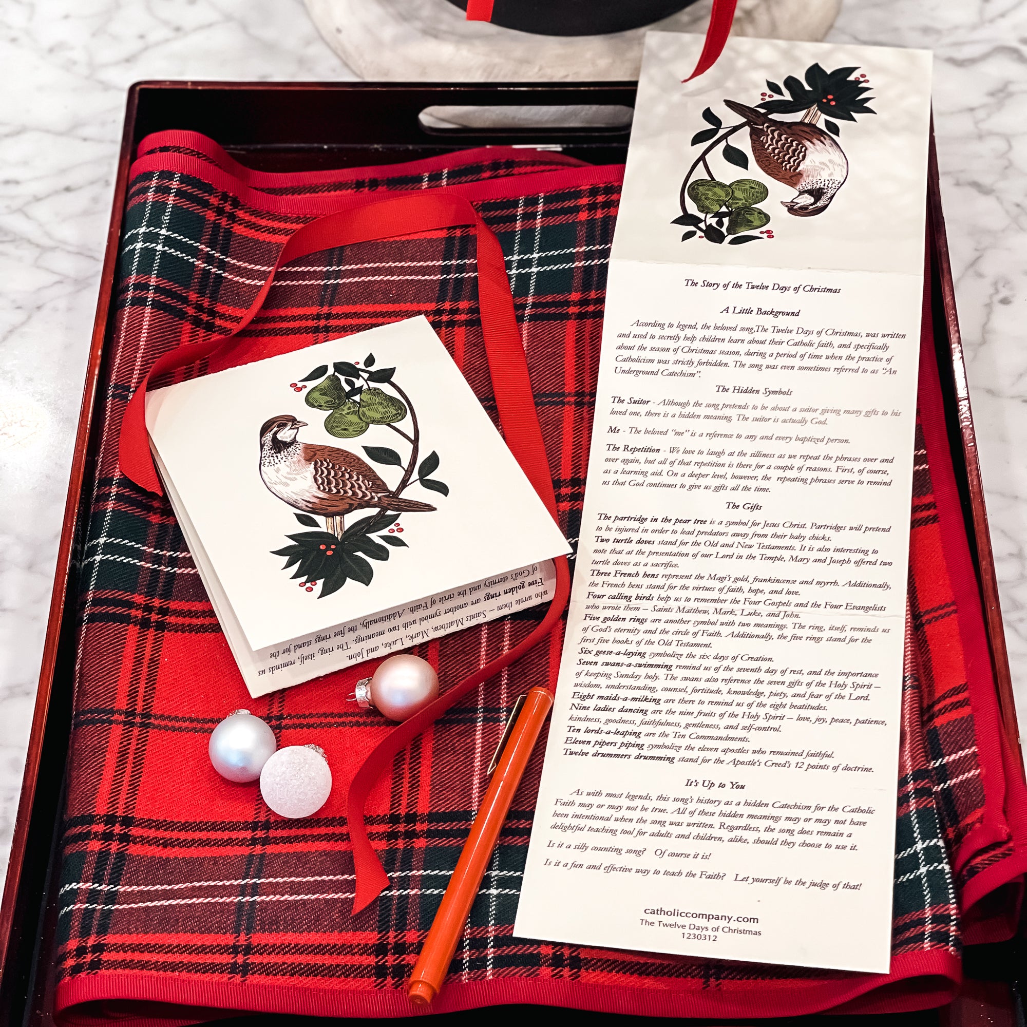 The card also features an explanation of the possible Catholic origins of the song. Legend has it that early Christians used this song to teach their children about the Faith, with each day representing a different tenet of Catholicism; the Four Calling Birds as the Four Evangelists, the Seven Swans A-Swimming as the Gifts of the Holy Spirit, and the Partridge as Christ Himself, Who was hung on a tree to save us from our sins.