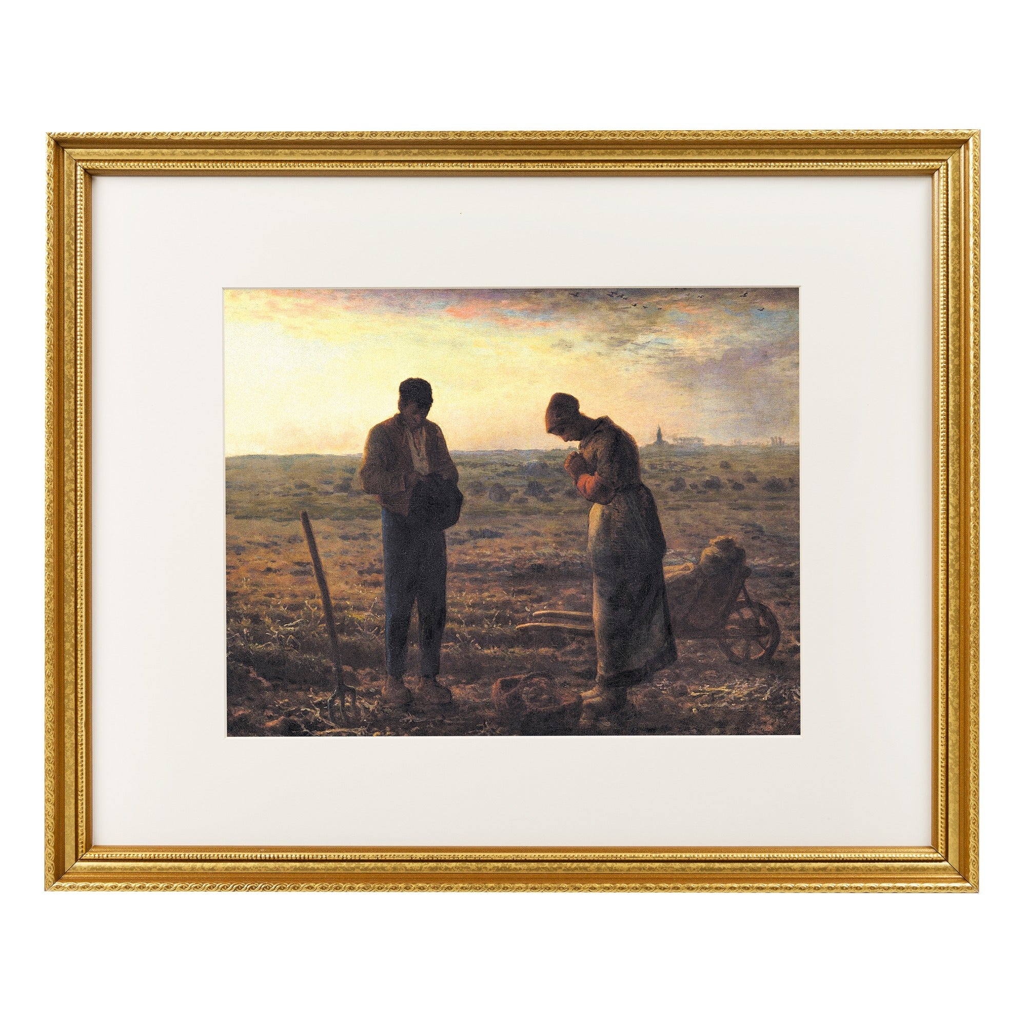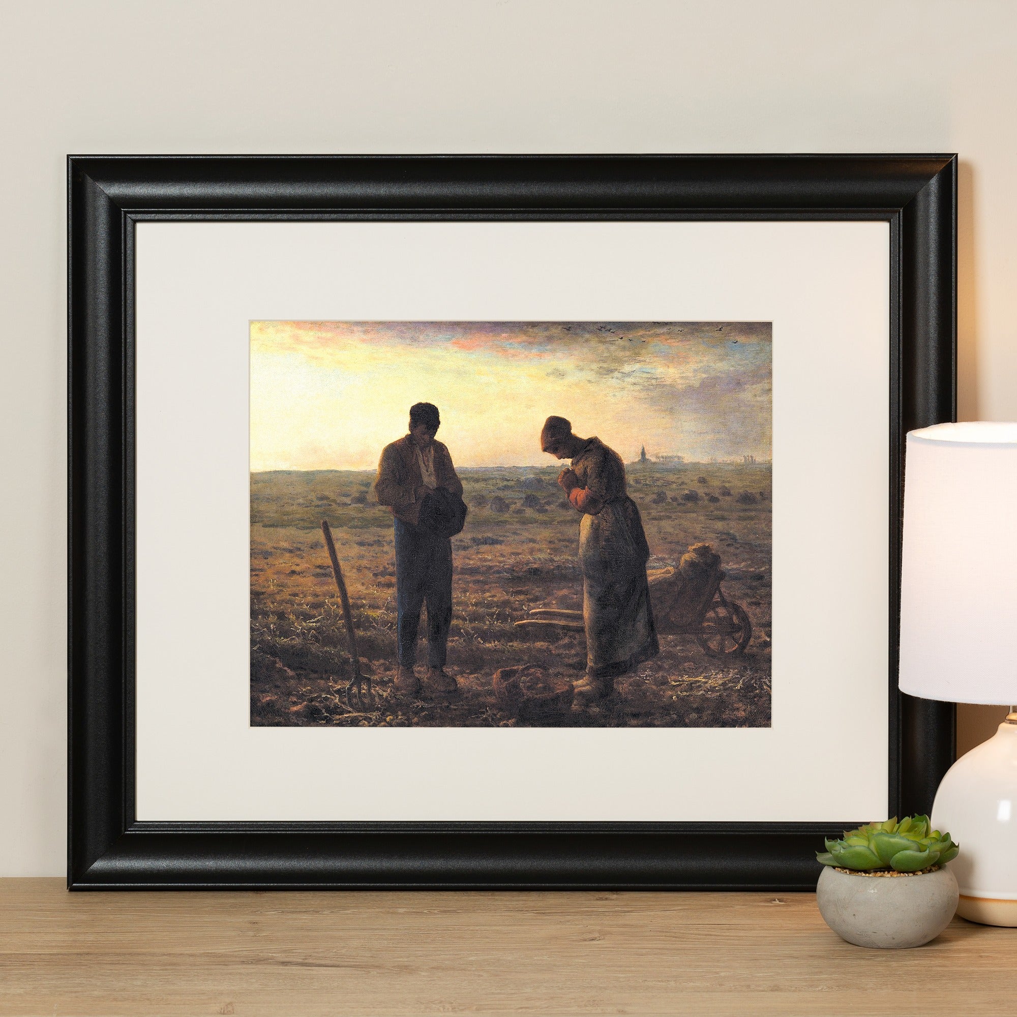 The original painting by Jean-Francois Millet "The Angelus" depicts two peasants bowing in prayer as they stop their work momentarily and respond to the sound of a distant church bell ringing with prayer. A reflective piece of art for your home, office, or school. Fill your space with classic religious artwork that moves the heart and mind closer to Our Father through prayer. Various framing options available. Designed and produced exclusively at The Catholic Company.