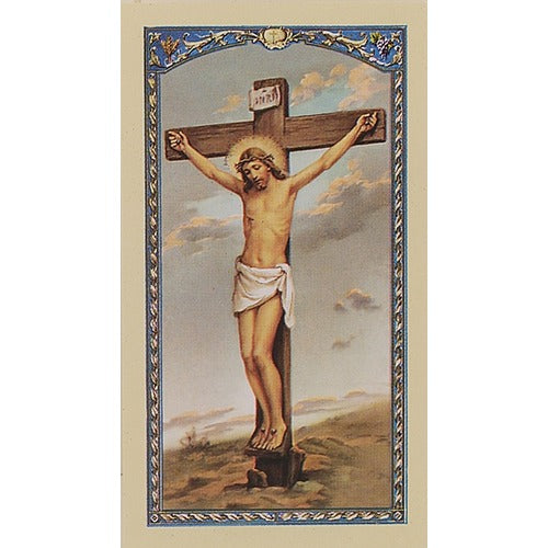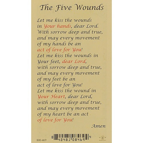 Durable and everlasting laminated holy prayer card that contains a color image of the Crucified Christ on the front, and a the Five Wounds of Christ prayer on the back. Card measures 2 1/2 inch by 4 1/2 inch. Back of card reads: Let me kiss the wounds in Your hands, dear Lord. With sorrow deep and true, and may every movement of my hands be an act of love for You! Let me kiss the wounds in Your feet, dear Lord, with sorrow deep and true, and may every movement of my feet be an act of love for You! Let me kiss the wound in Your Heart, dear Lord, with sorrow deep and true, and may every movement of my heart be an act of love for You! Amen. Made in Italy!