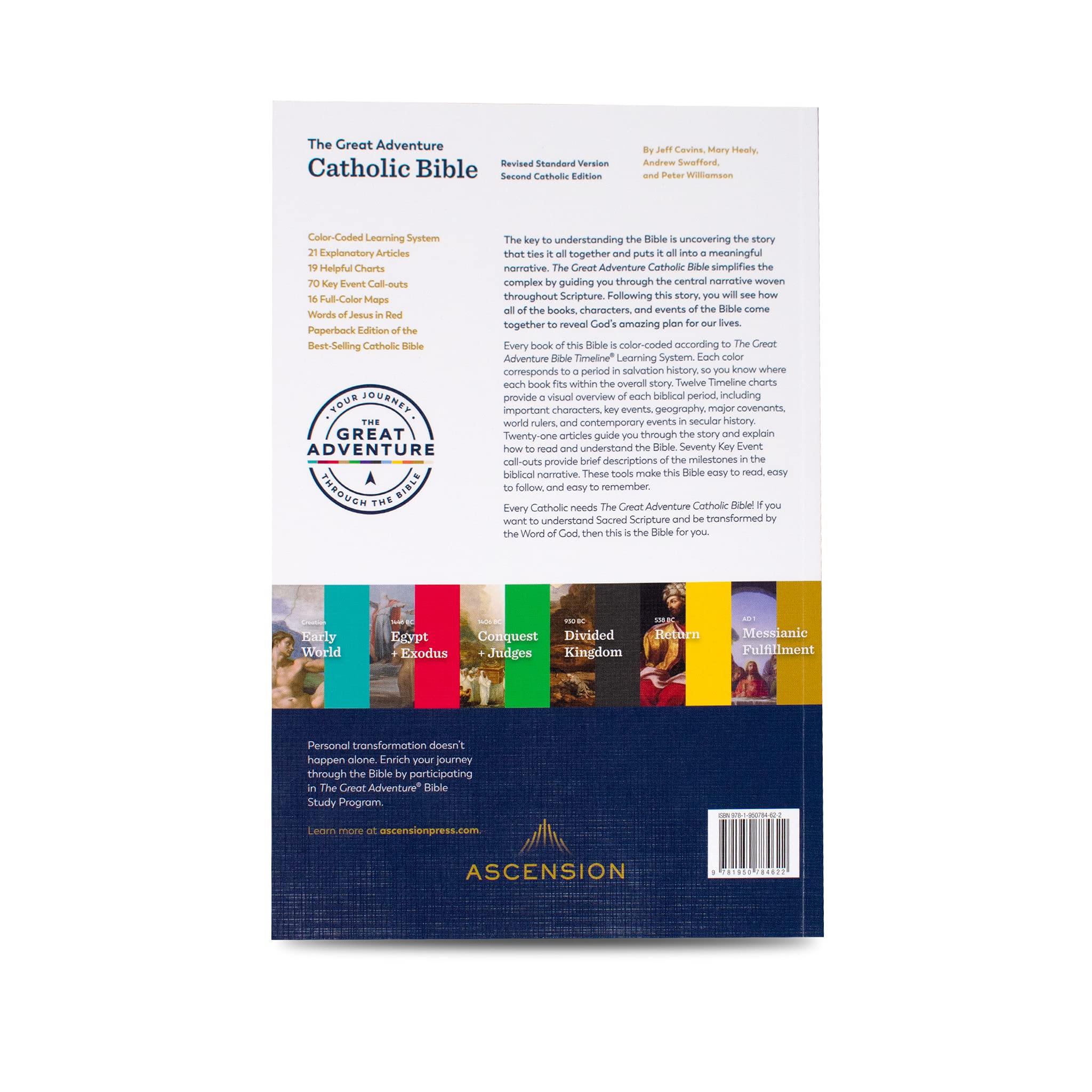 The Great Adventure Catholic Bible - Paperback Edition is designed to simplify Bible reading with color-coded tools, tabs, maps, and insightful commentary. Ideal for new, confirmed, or curious Catholics, this Bible integrates The Bible Timeline Learning System, making it easier to understand salvation history. Used in the popular podcast The Bible in a Year, it includes full-color illustrations and the Revised Standard Version text.