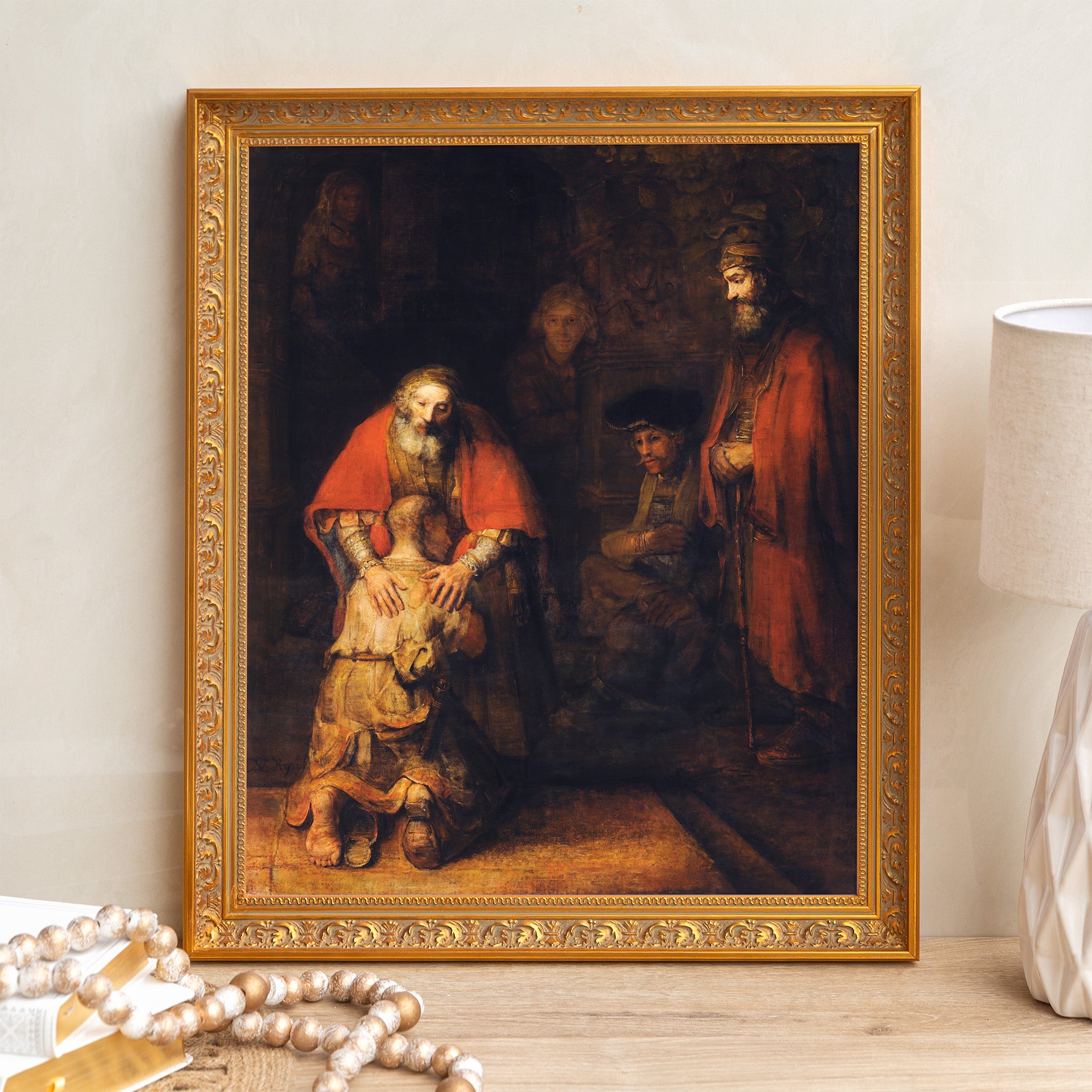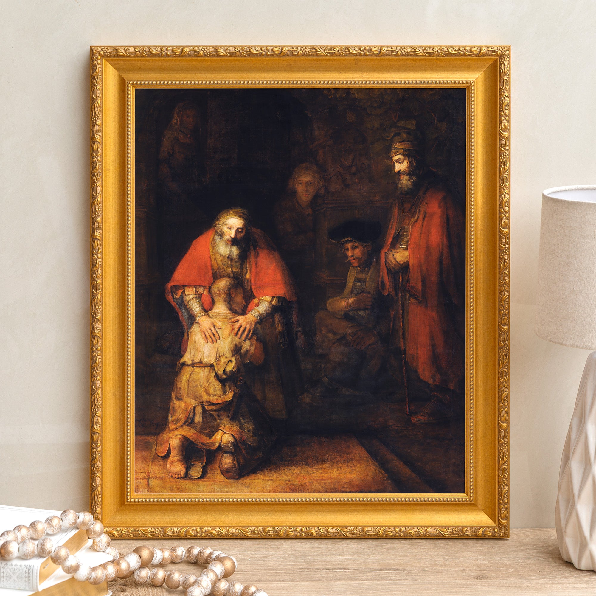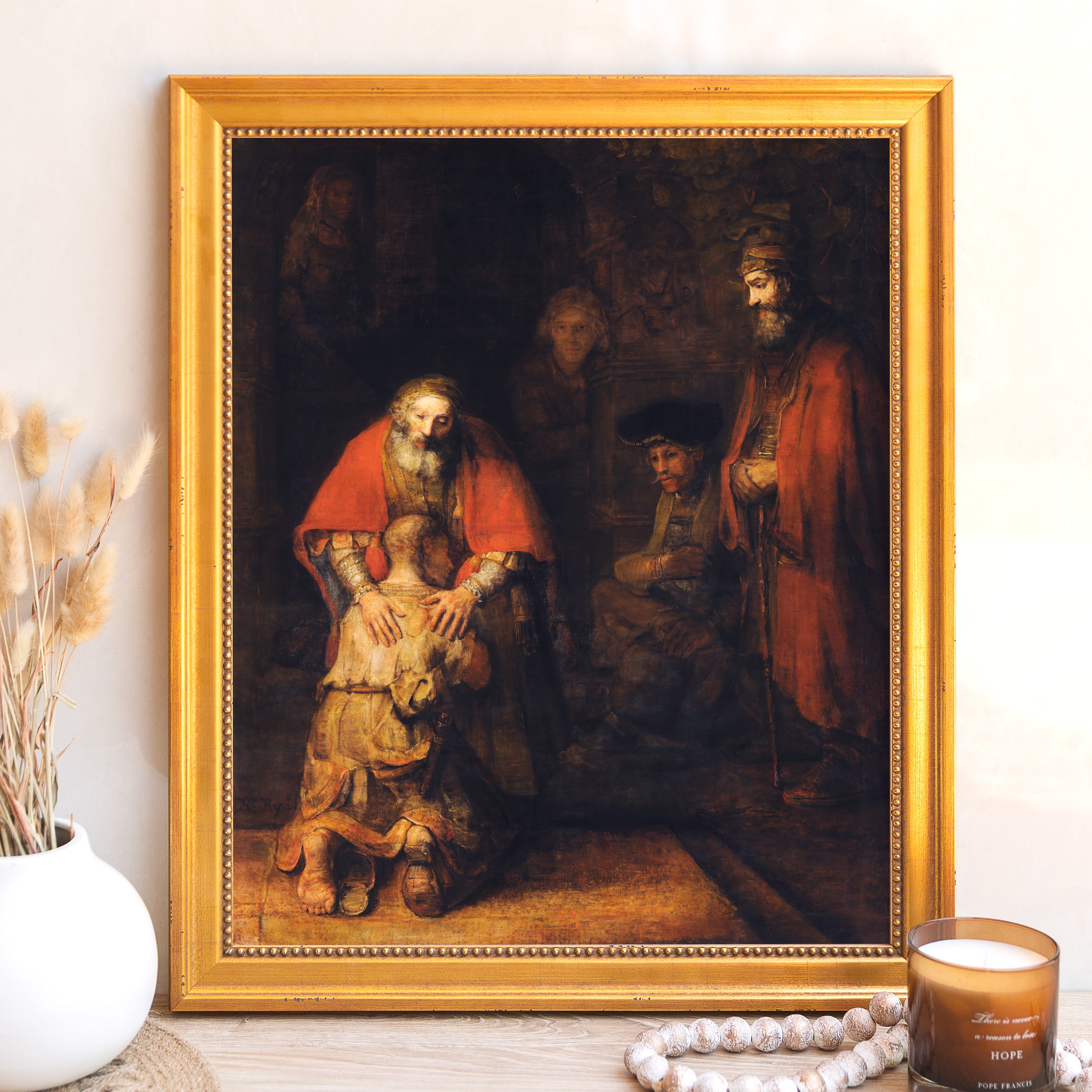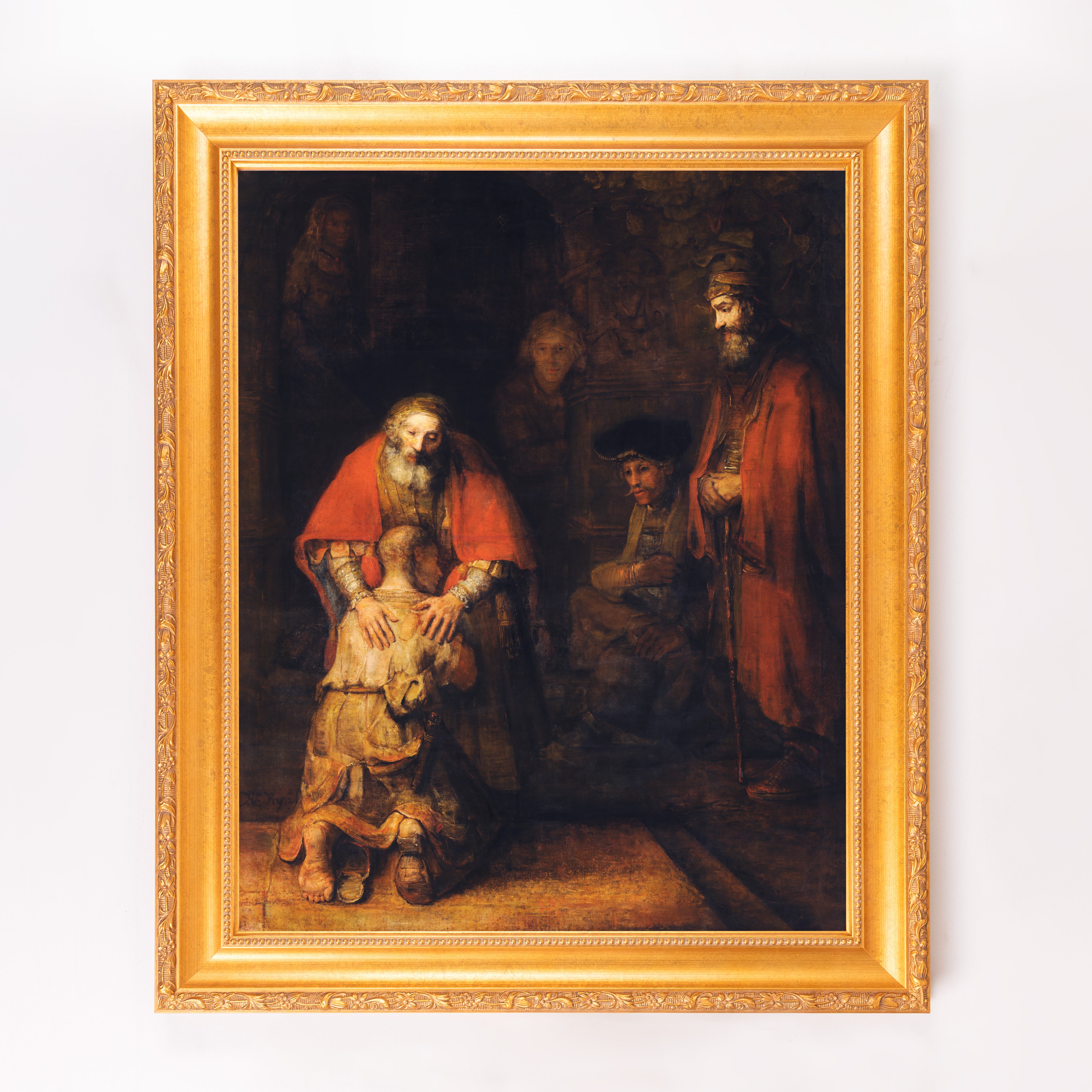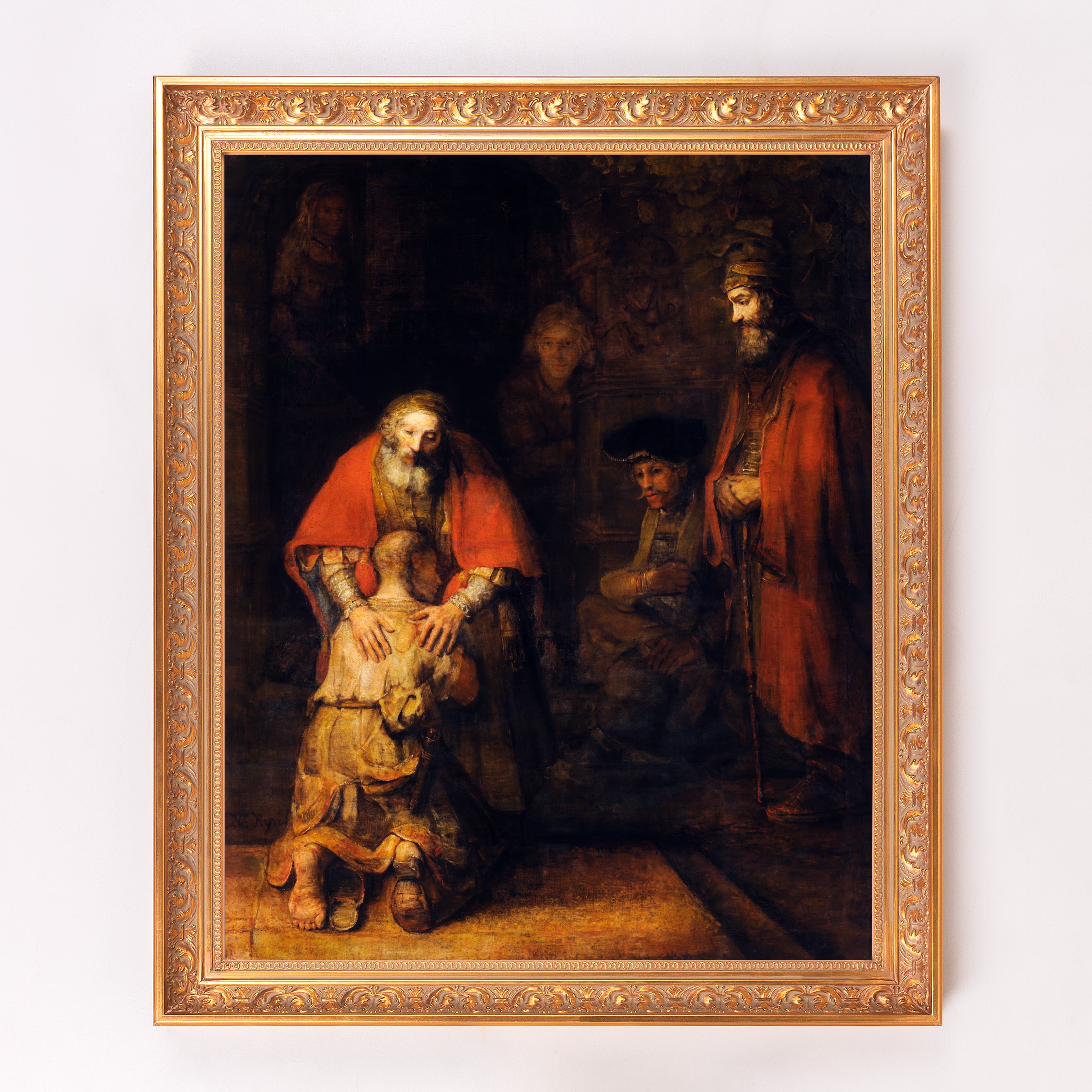 The Prodigal Son Framed Canvas from the Sacred Signature Collection at The Catholic Company is a beautifully crafted masterpiece featuring Rembrandt's classic artwork. Created in-house by skilled artisans in Charlotte, NC, each piece is printed on canvas and framed in ornate or classic gold wood. This exclusive, gallery-quality art is designed to elevate sacred spaces, making it a meaningful devotional piece or gift.