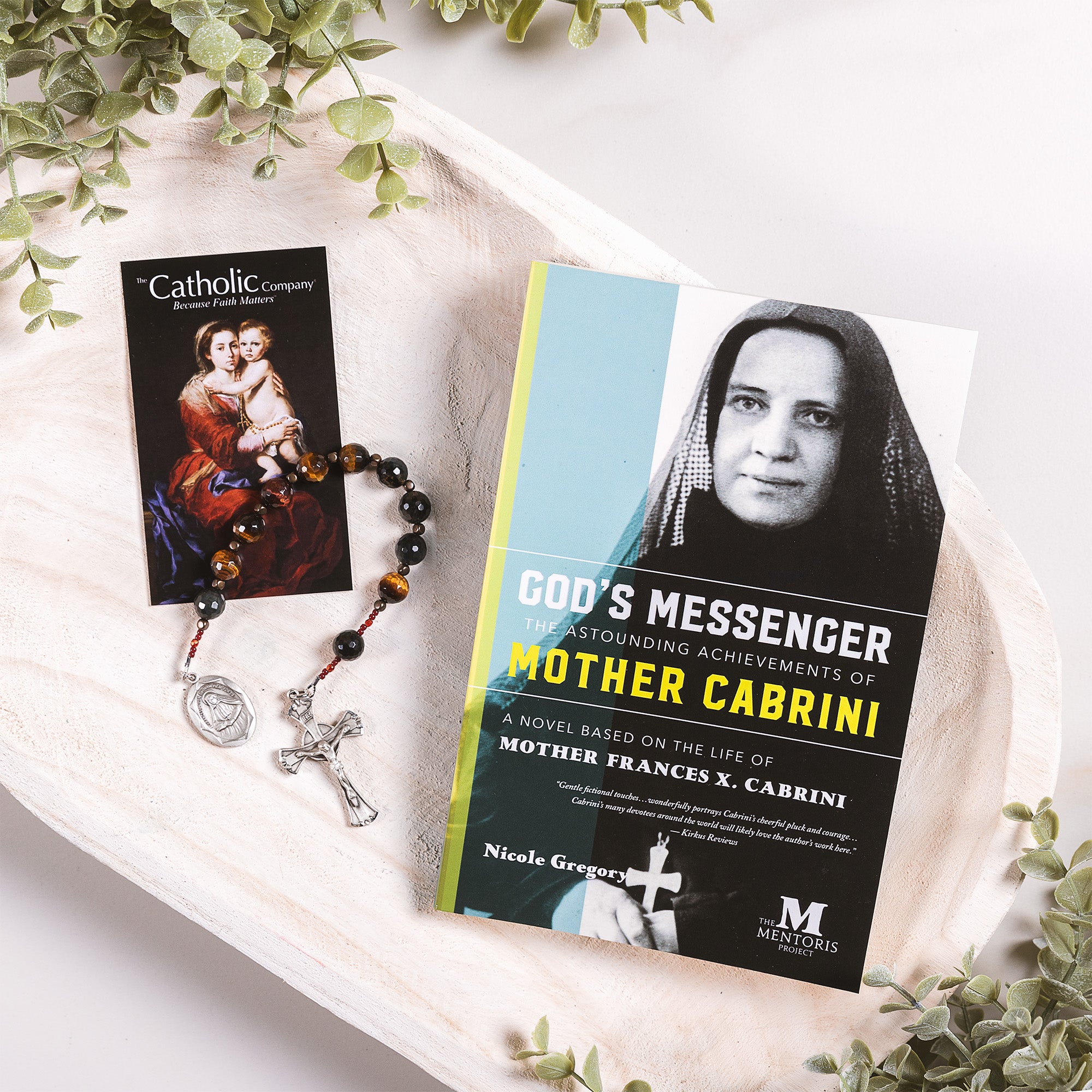 Celebrate the inspiring life of Mother Cabrini with this exclusive gift set that includes a handcrafted Tiger Eye Tenner and the novel "God's Messenger." The one-decade rosary features courage-signifying gemstones, fire-polished crystals, and a silver medal, while the historical novel details her unwavering dedication to serving immigrants. An heirloom quality gift of faith, courage, and inspiration.
