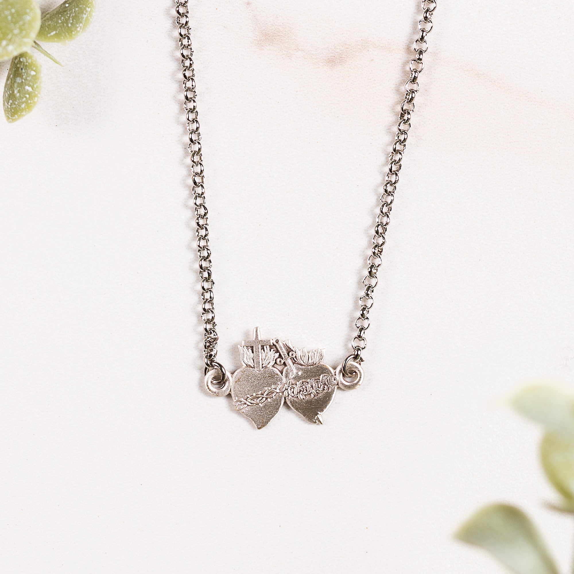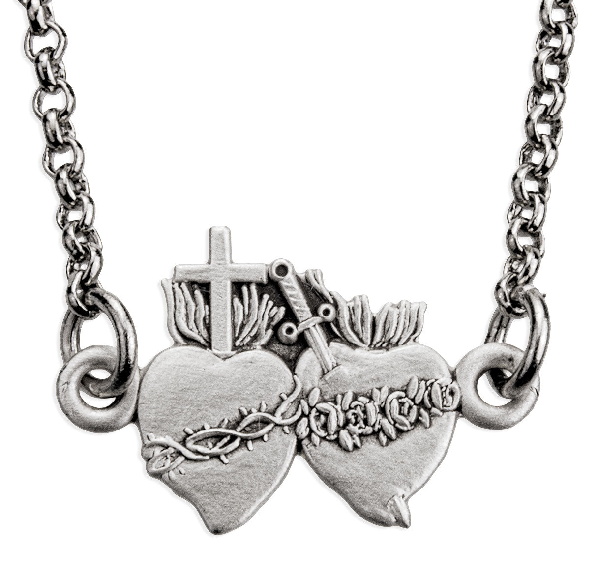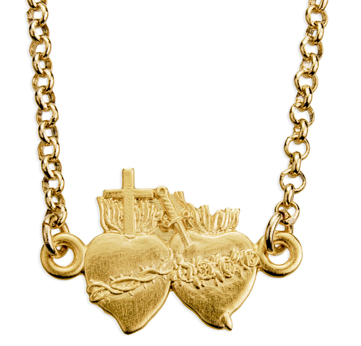 This delicate necklace honors the Two Hearts of Jesus and Mary, and features a centerpiece pendant of the Sacred & Immaculate Hearts, joined to a petite chain. A precious gift of faith and meaning. Choose 16 KT Gold or Sterling Silver. Made in the USA.